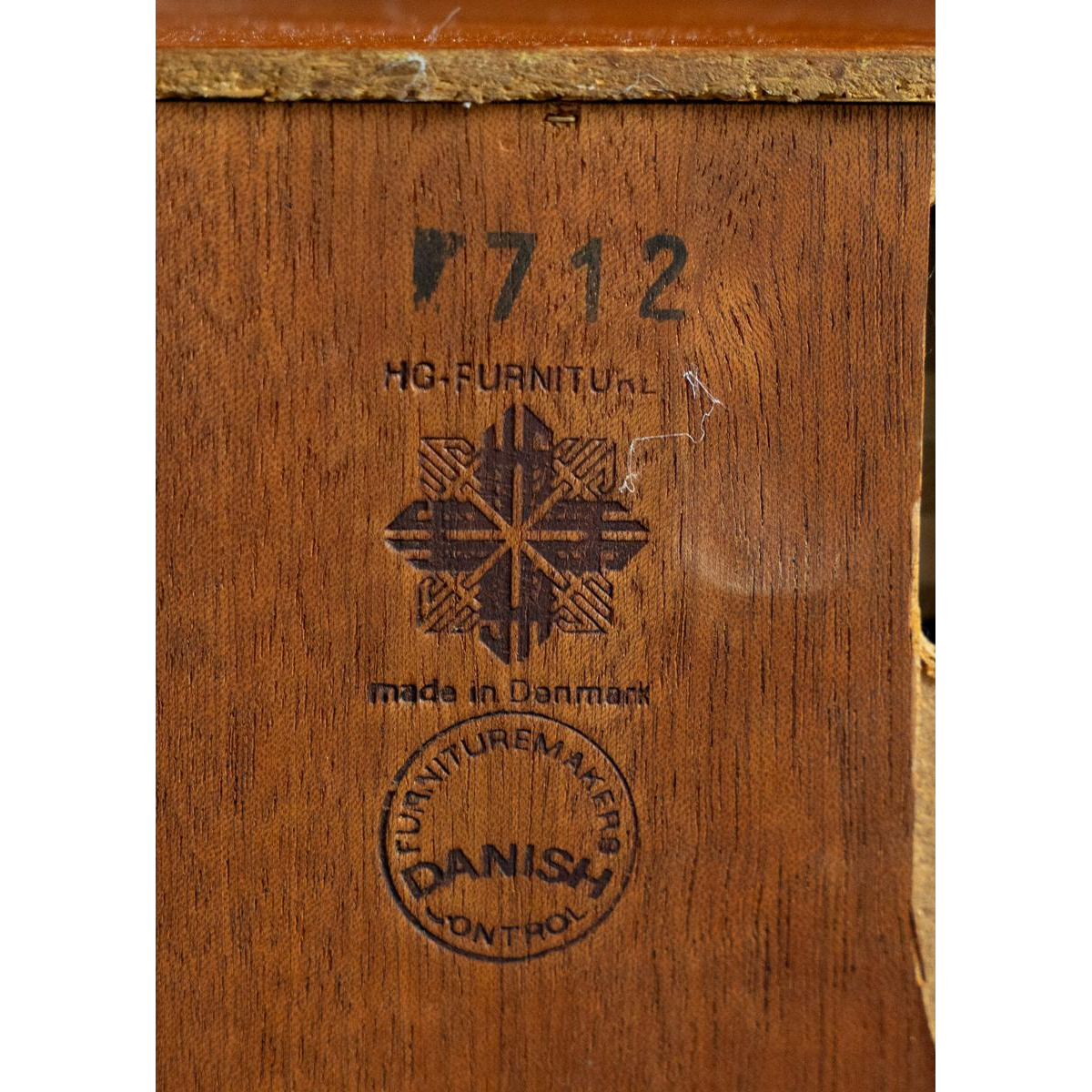 Estampille "HG Furniture" et label "Danish control" à l'arrière-petit-enfant de la commode.