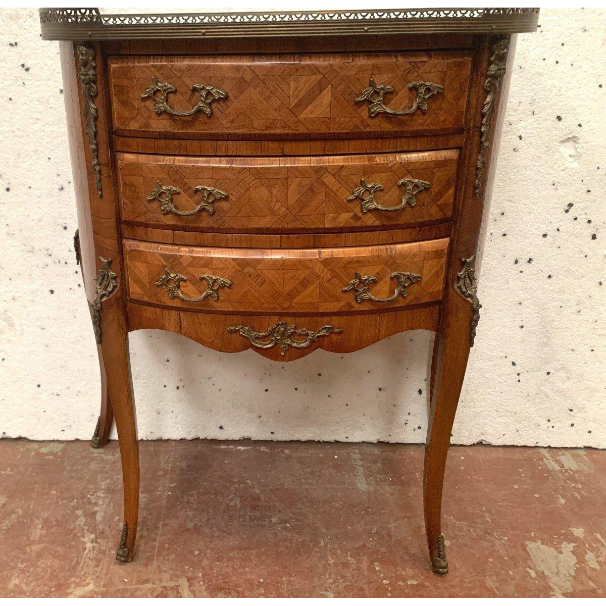 Ce formulaire permet uniquement de nous faire part d'un contenu illicite sur le produit : Commode demi-lune sur pieds, de style Louis XV, en marqueterie à fond de cubes, XX siècle.