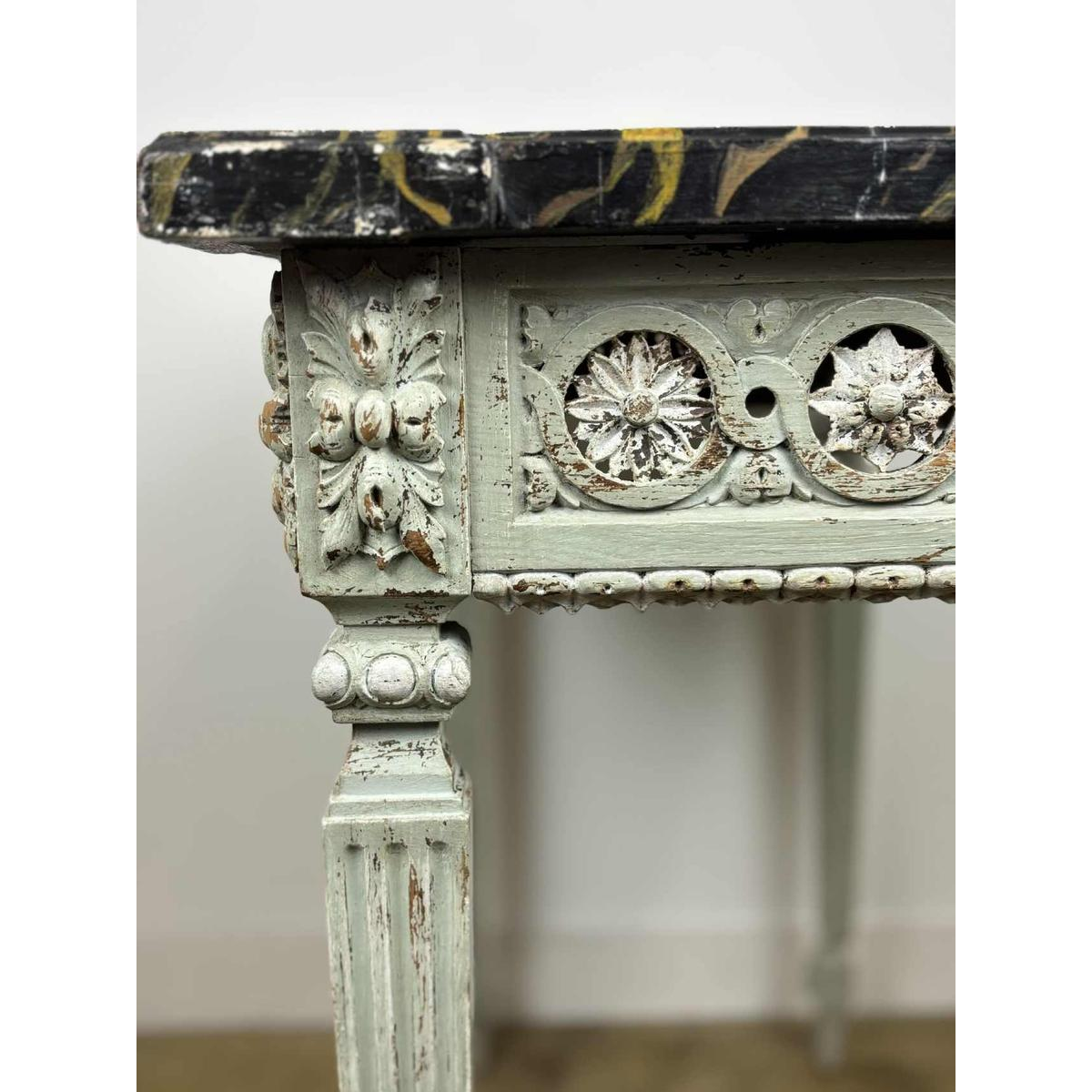 Le plateau est probablement un ajout ancien, en bois peint en imitation marbre noir veiné de brun doré, réalisé au XIXe siècle.