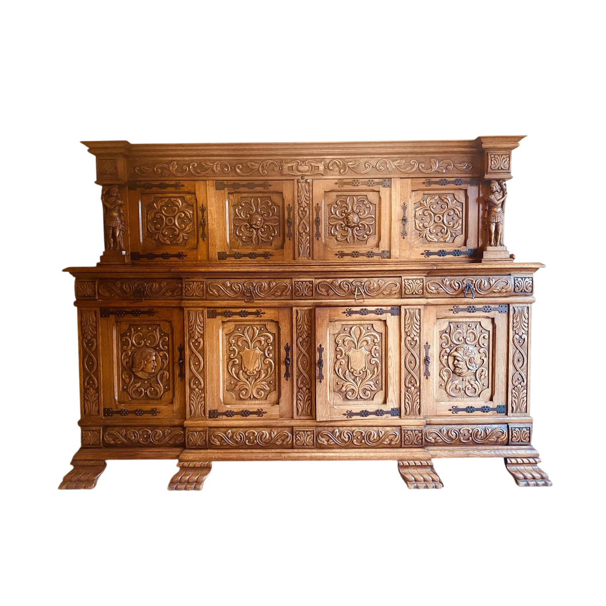 Meuble de style Renaissance en chêne massif reposant sur quatre piétements en consoles et pieds griffes, comportant quatre tiroirs sculptés en milieu de façade, agrémenté de huit portes sculptées à motifs différents ( mascaron et blasons ).