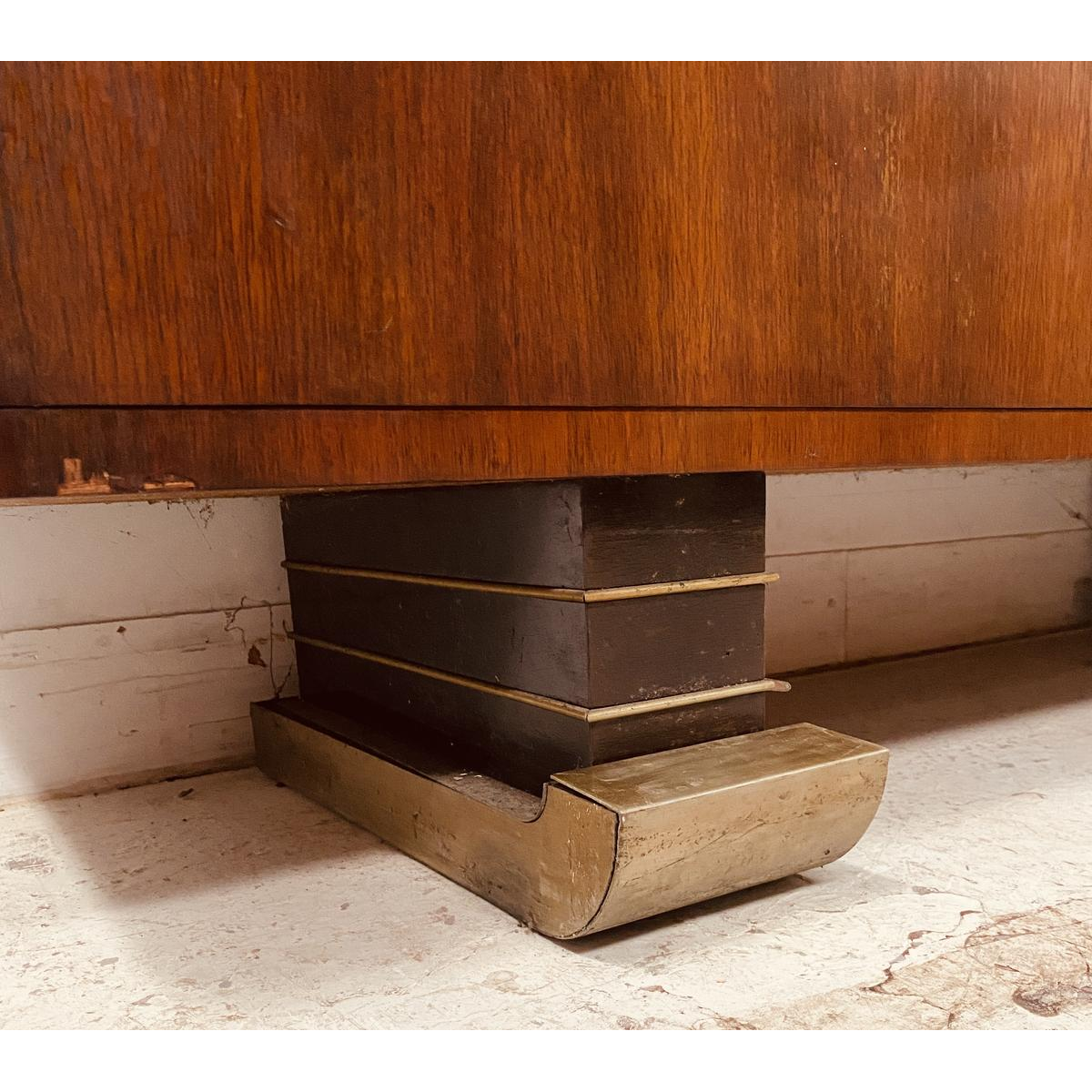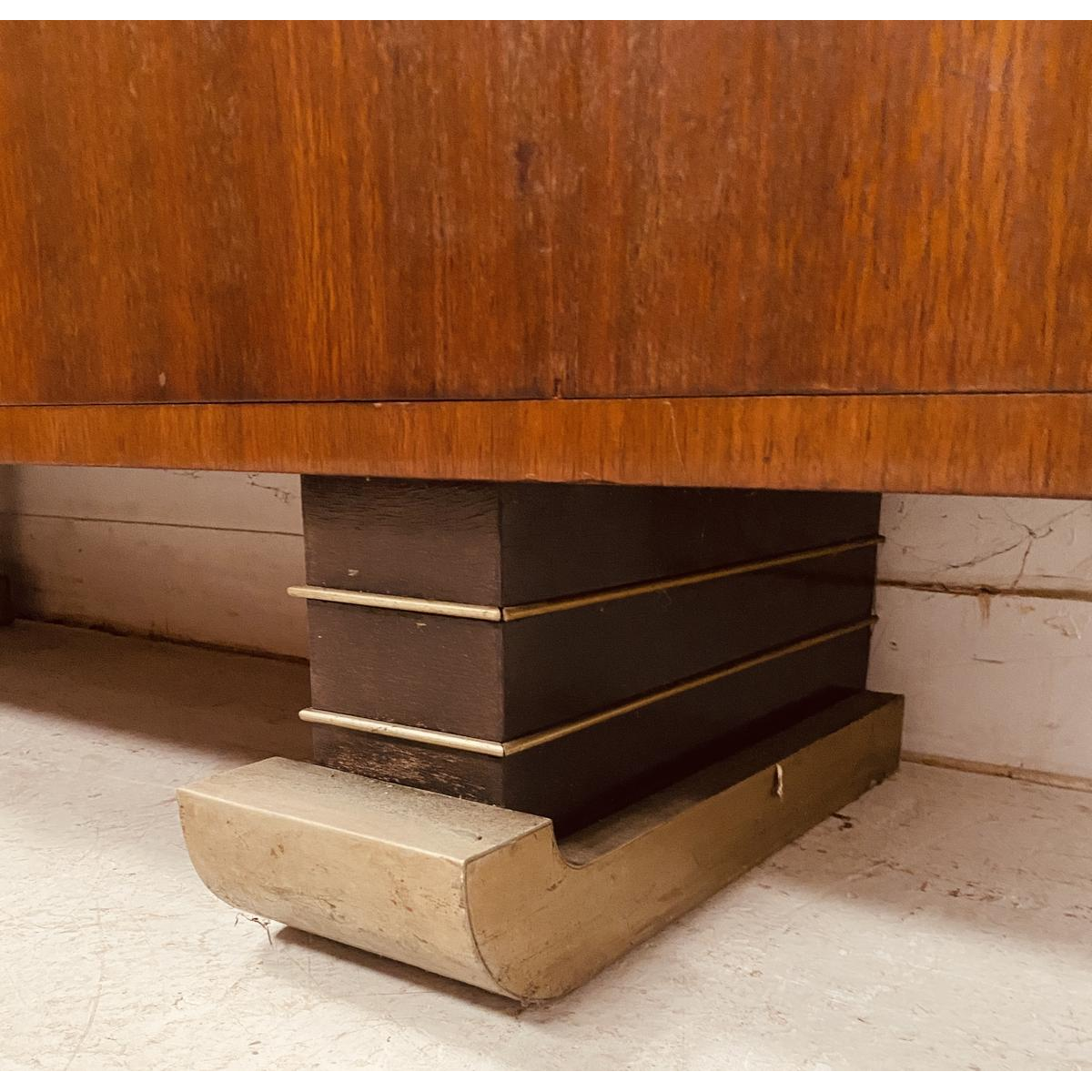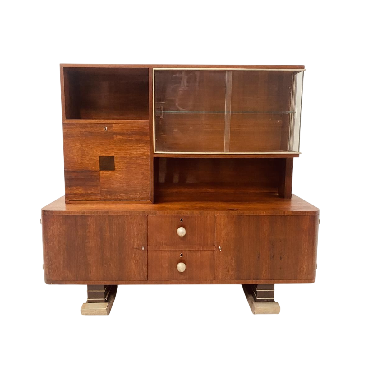 Meuble architectural époque Art Déco formant vitrine et bar reposant sur des pieds en forme de ski.