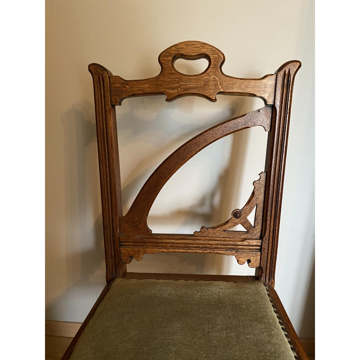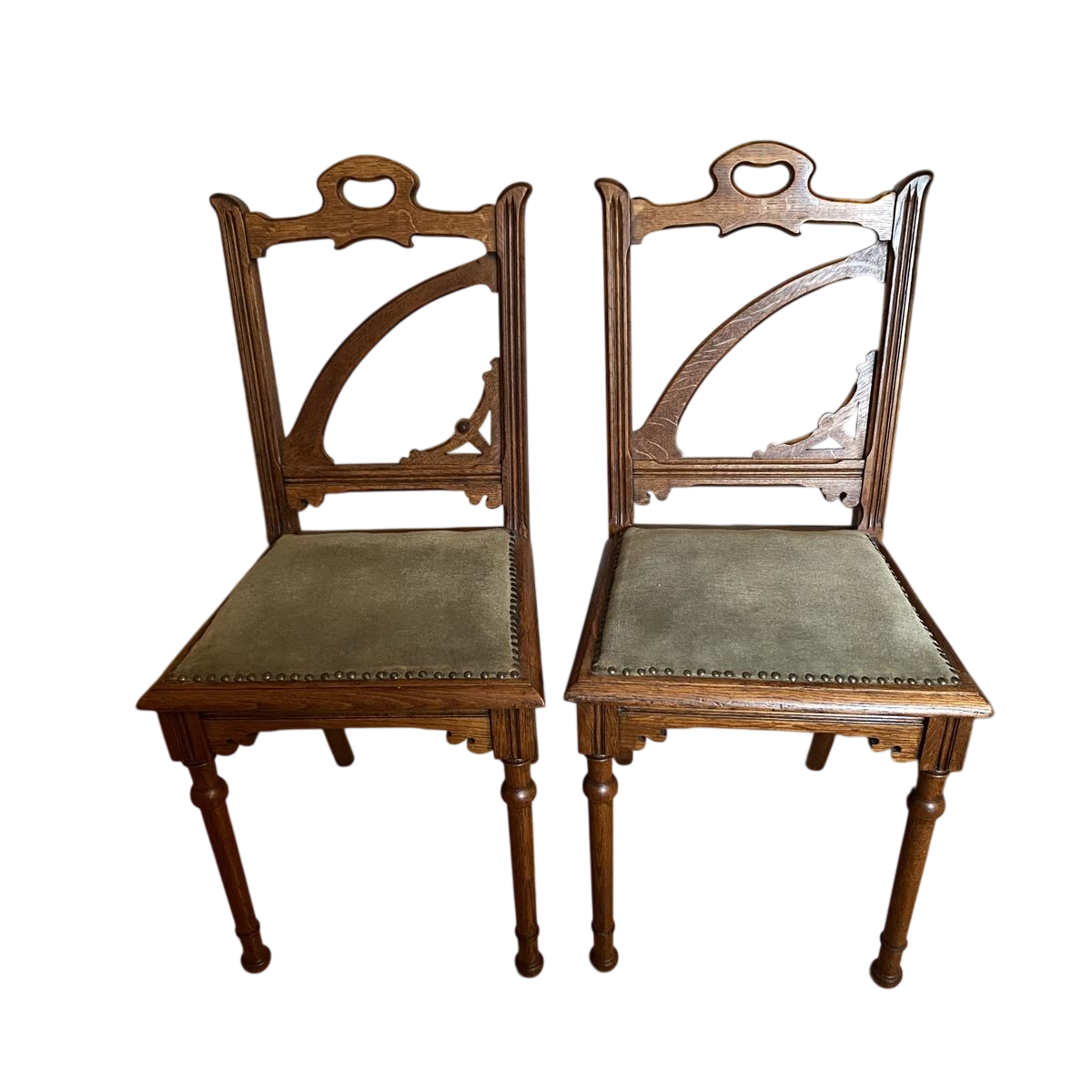 Paire de jolies chaise décoratives Art Nouveau en chêne. Dossier, assise et cotés sculptés. Pieds avant cylindrique, tournés et droits, pieds arrière en sabre. Assise en velours vert en bon état. Très bon état général.
