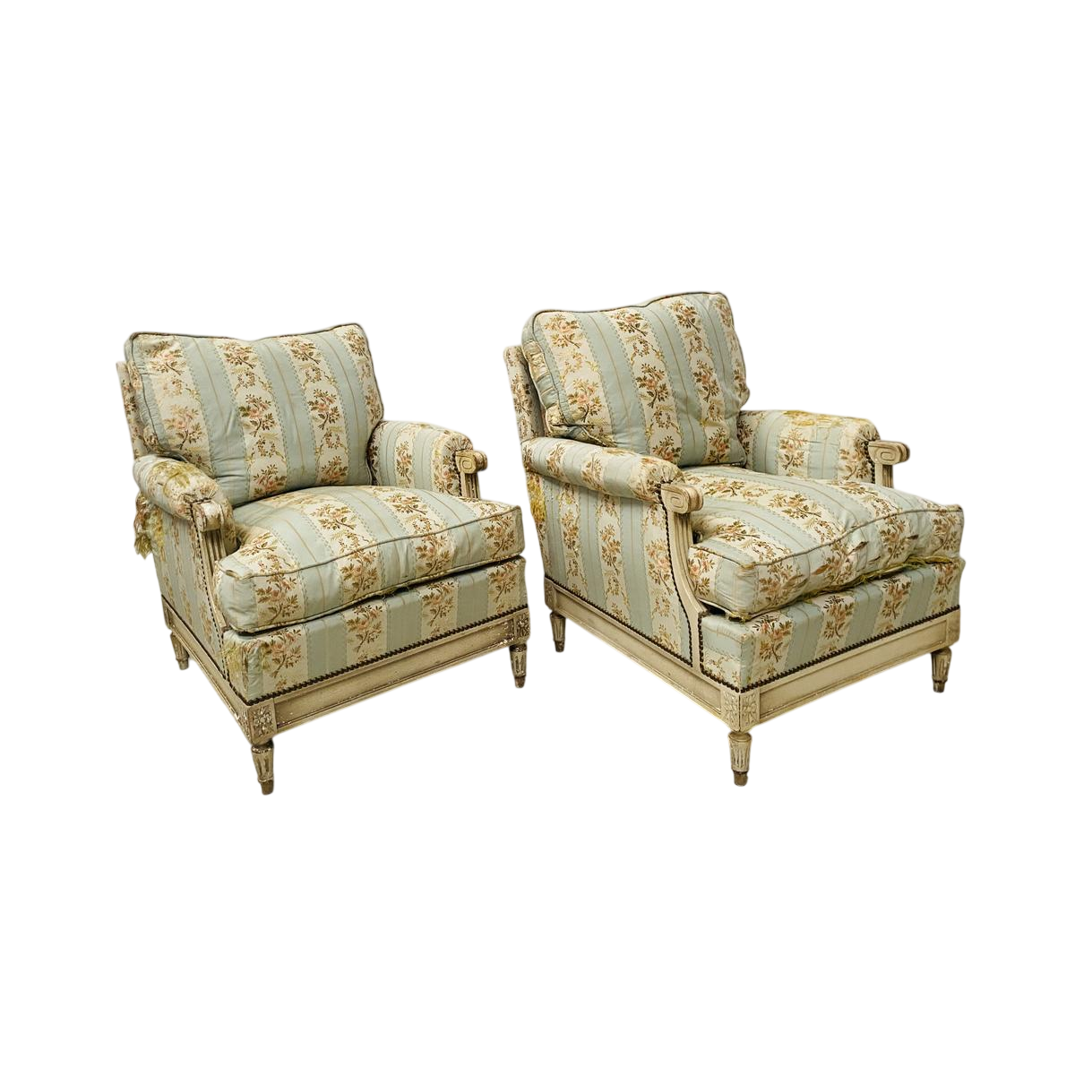 Paire de fauteuils confort de style Louis XVI en hêtre patiné à l'antique.