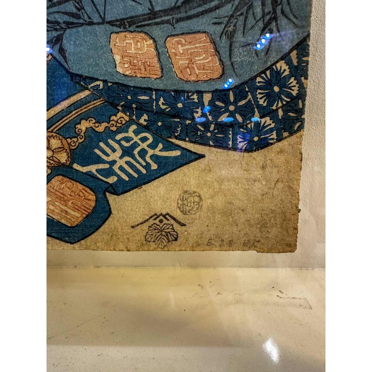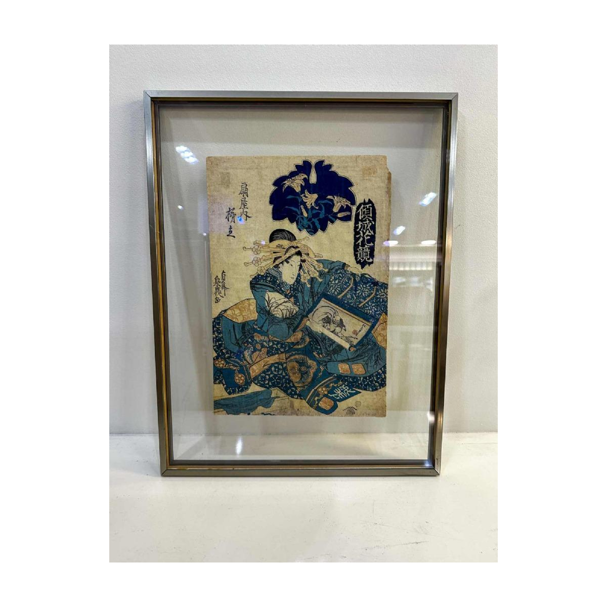Estampe japonaise de l'artiste Utagawa Kunisada, aussi appelé Toyokuni III; cadre en verre permettant de voir le dos de l'estampe; signature sous forme de cachet de l'artiste