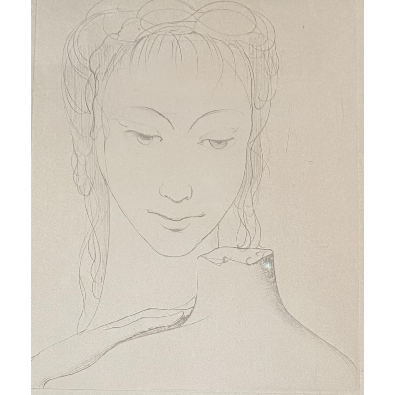 Très jolie lithogravure de Marcel Delmotte représentant un visage féminin, à coté d'une statue. Dessin classique avec un coté surréaliste, peut-être inspiré du monde de De Chirico, très apprécié par Delmotte. Signature au crayon de M.Delmotte, cachet à sec de l'imprimeur avec signature.