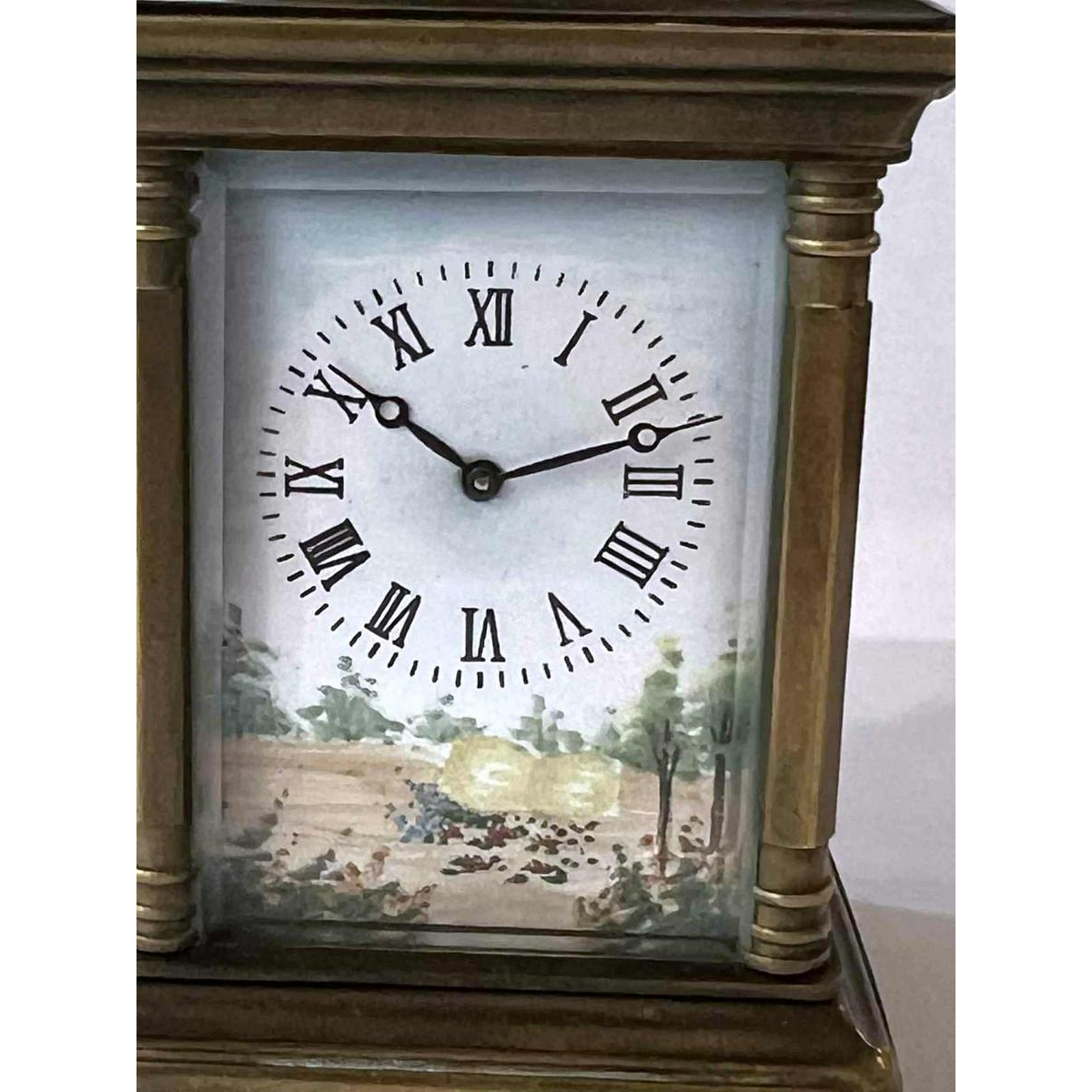Cadran en émail avec les chiffres romains et décor d'un paysage peint.