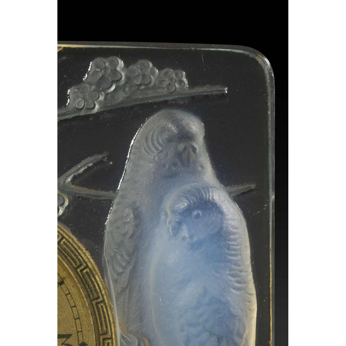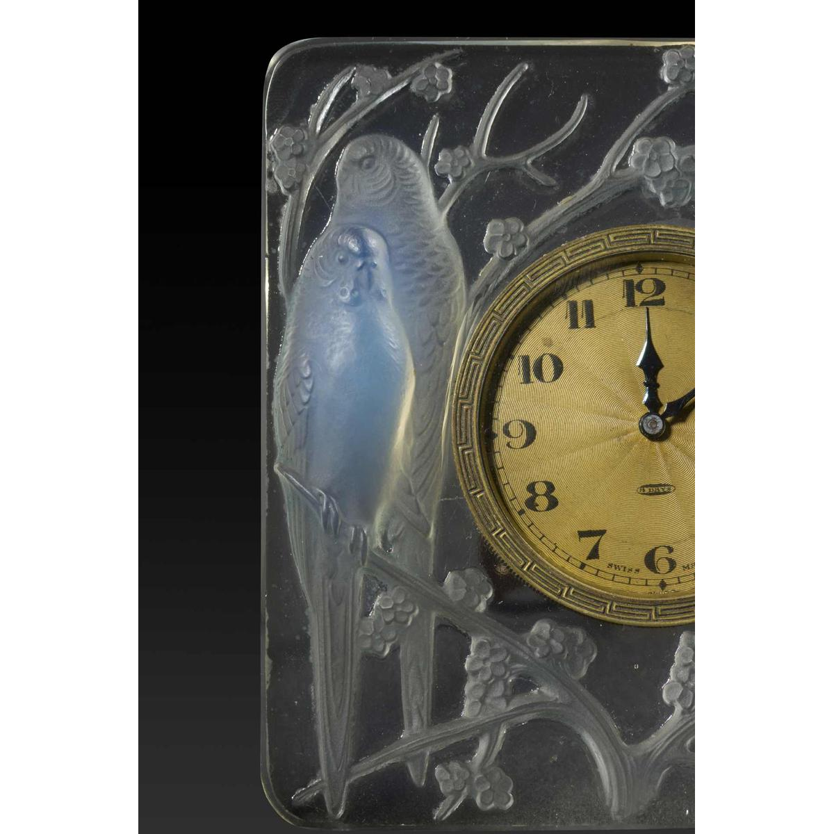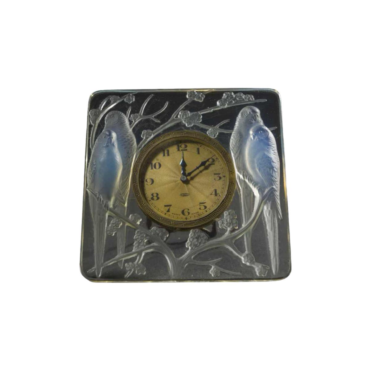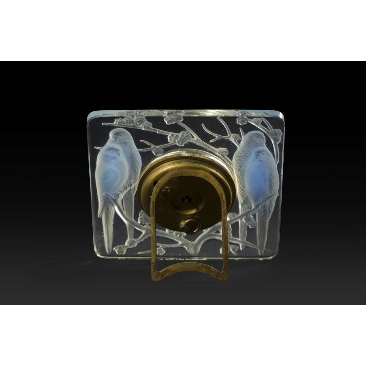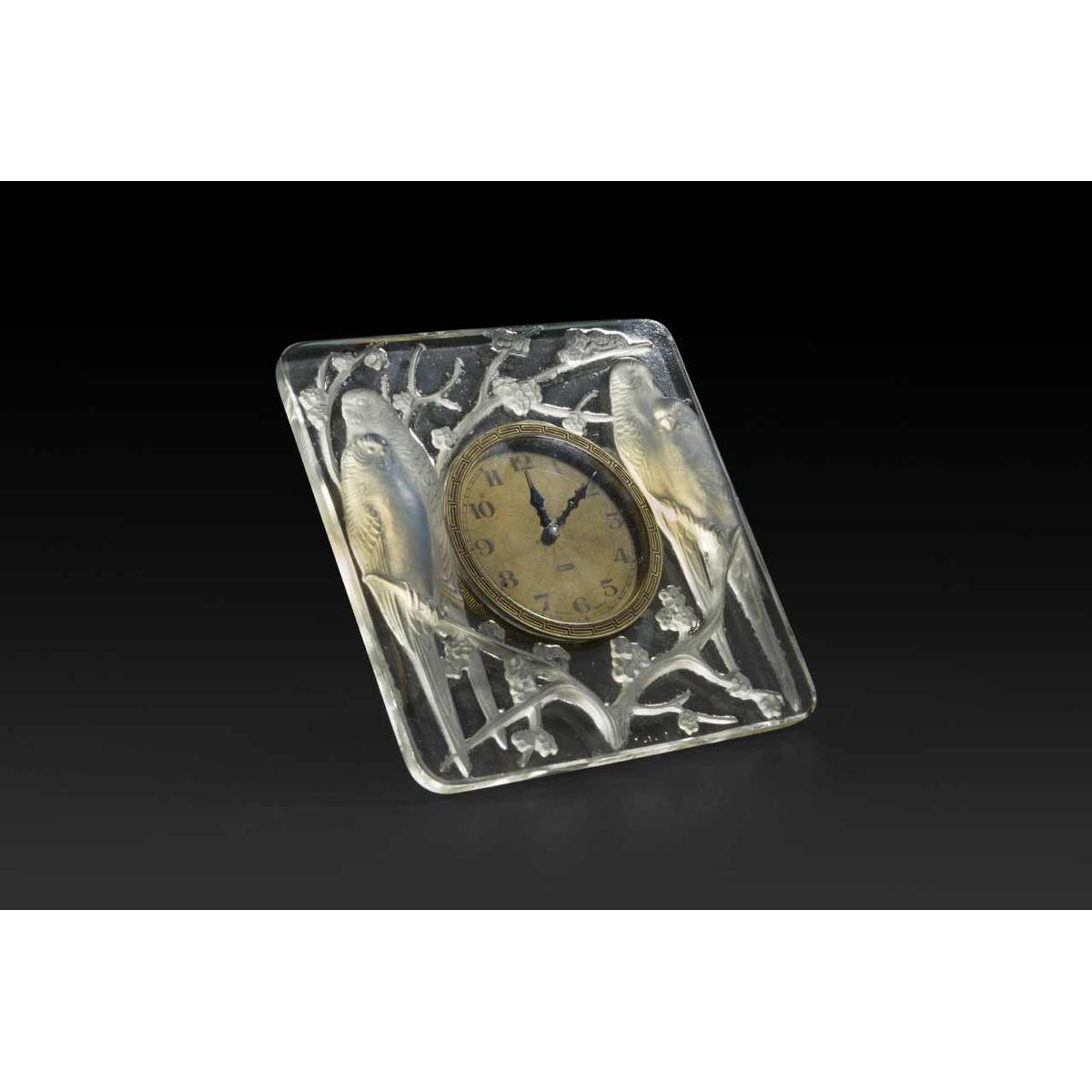 « INSEPARABLES » une pendulette en verre Art déco de RENE LALIQUE (1860-1945). Moulée en relief avec deux couples d'amoureux bleu opalescent assis sur des fleurs de prunus. Mouvement suisse (indiqué sur le cadran) à huit jours.