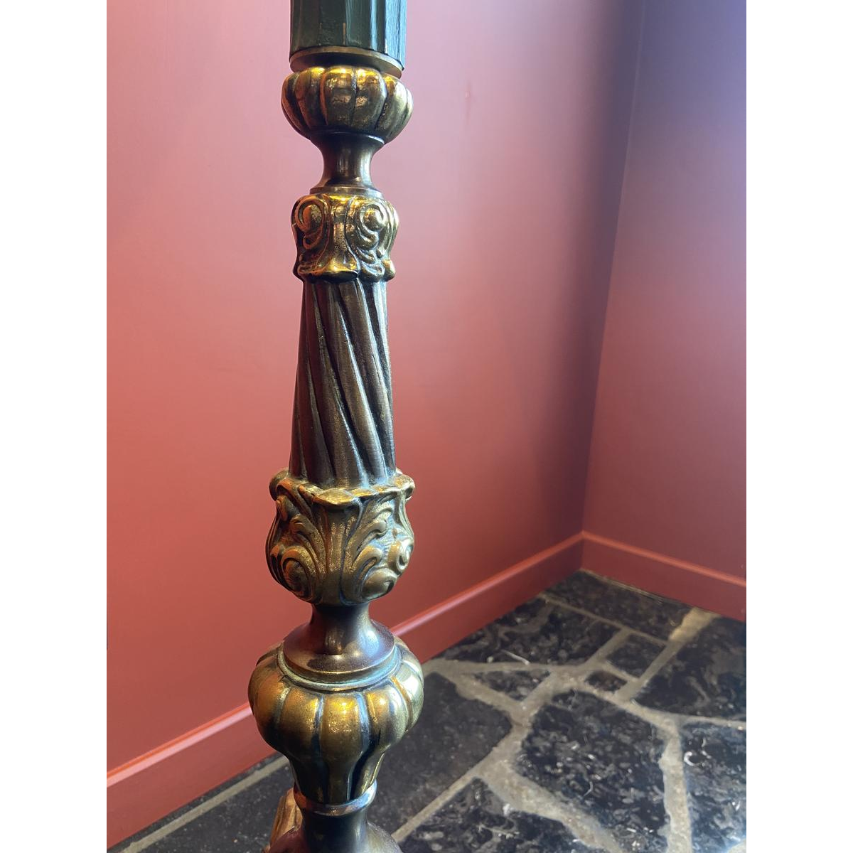Lampadaire (lampe de sol) : style : classique, matériau : Bronze, couleur principale : Doré, cable : Tissu vert foncé - Approx 2m, soquet : Noir en baquelite, dimensions totale a+p (cm) : 150.0, poids (kg) : 9.0, détails : Partie de tige peinte en vert foncé