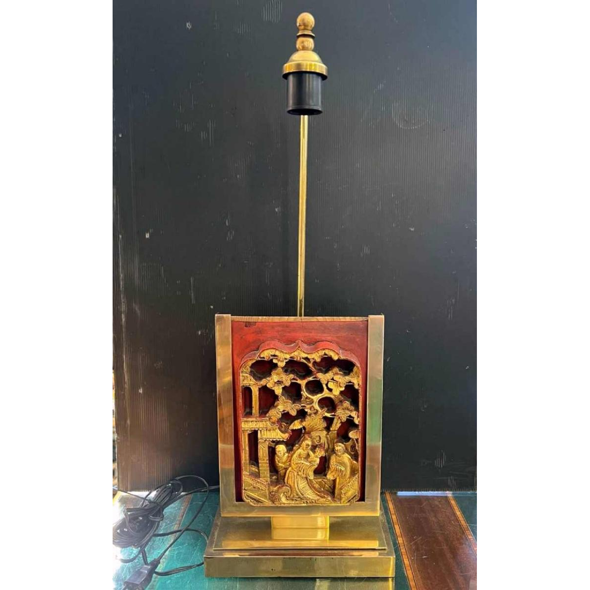 Lampe de table en laiton doré et un panneau sculpté laqué rouge et doré de style chinois.