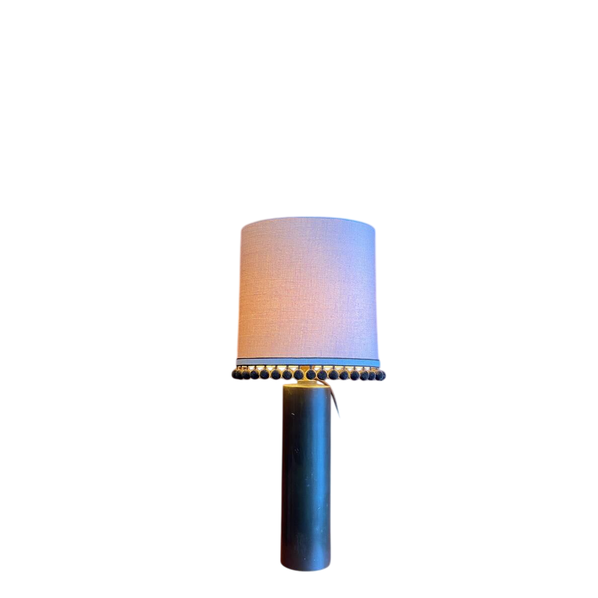 Le pied de lampe est réalisé à partir d’une ancienne bouillotte en cuivre, assurant stabilité et présence décorative.
