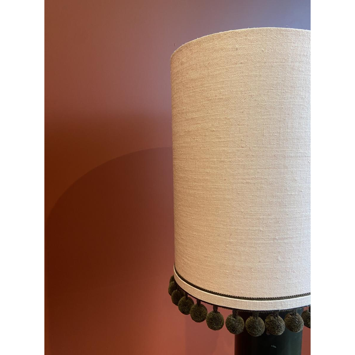L’abat-jour est confectionné à partir d’un tissu en soie de la maison Ashoka Silk, garni de pompons de chez Houlès.