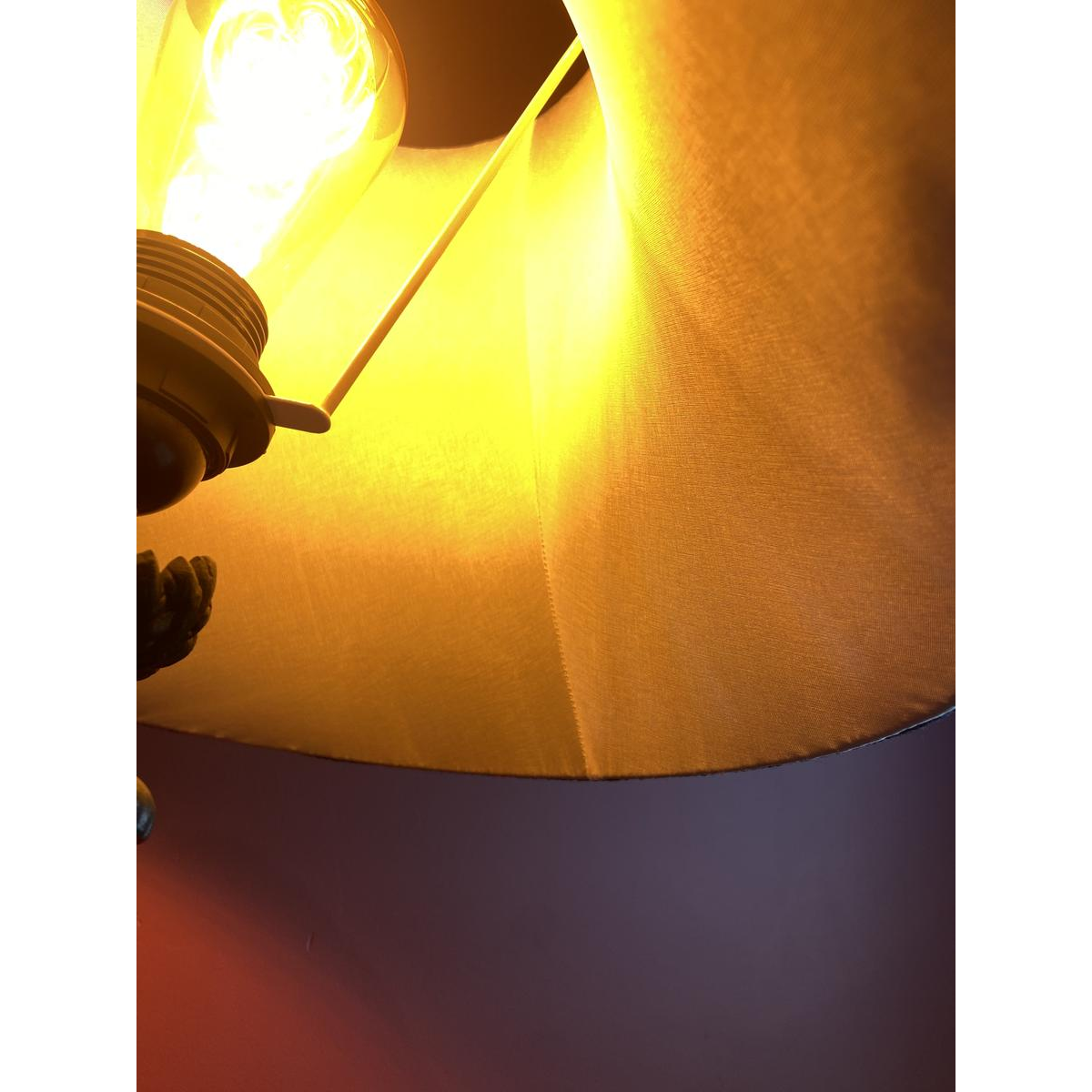 Abat-jour : style : Autre, matériau : Soie, couleur principale : Noir, marque tissu : Soie China HABOTAI, type de tissu : Soie, détails : Abat-jour de forme cônique tronquée. Style Français. Tissu Habotai translucide. Doublé du même type de tissu mais en blanc écru. Ensemble garni de chenille/passementerie "Ile de France".