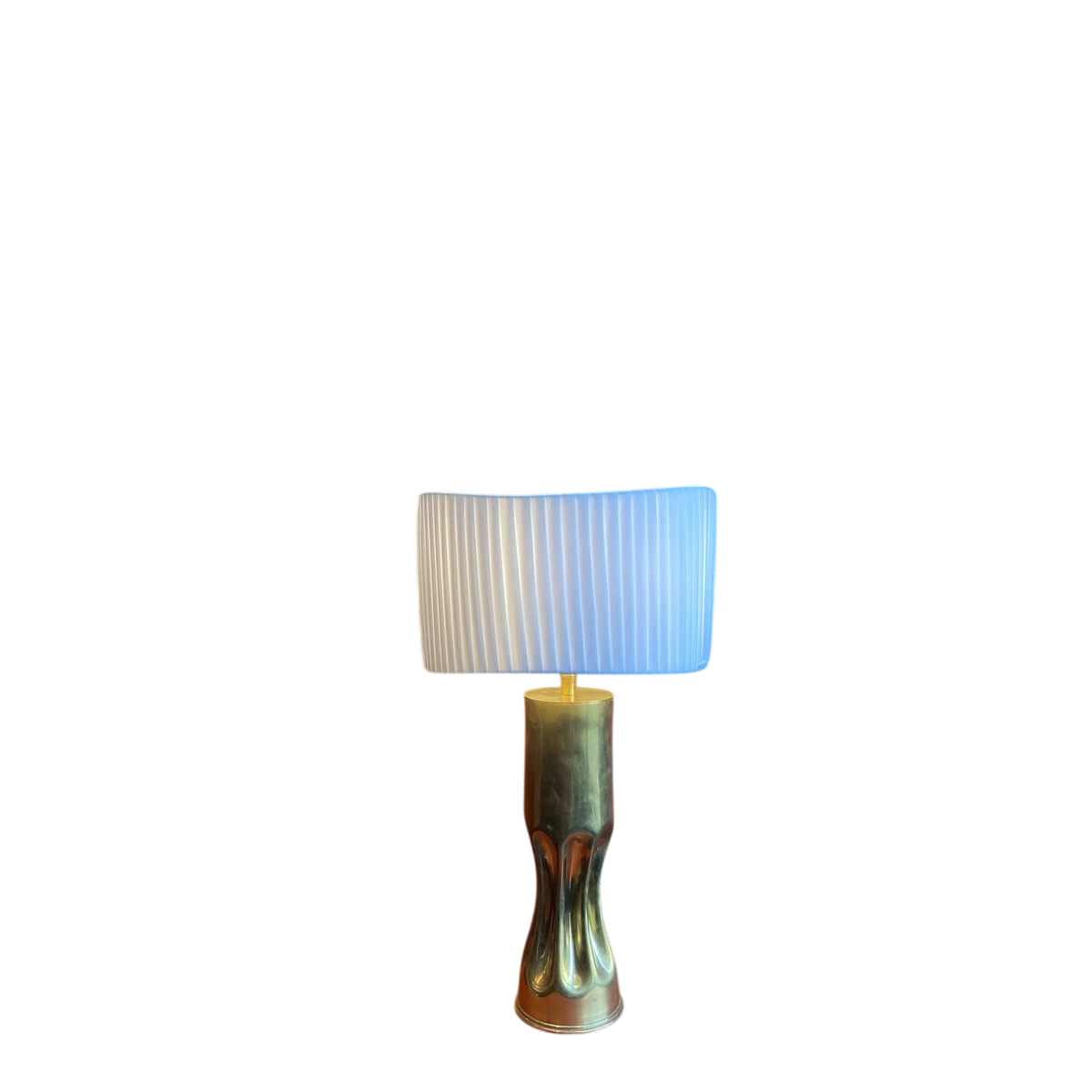 Lampe artisanale avec abat-jour cylindrique ondulé plissé et douille d'obus en laiton