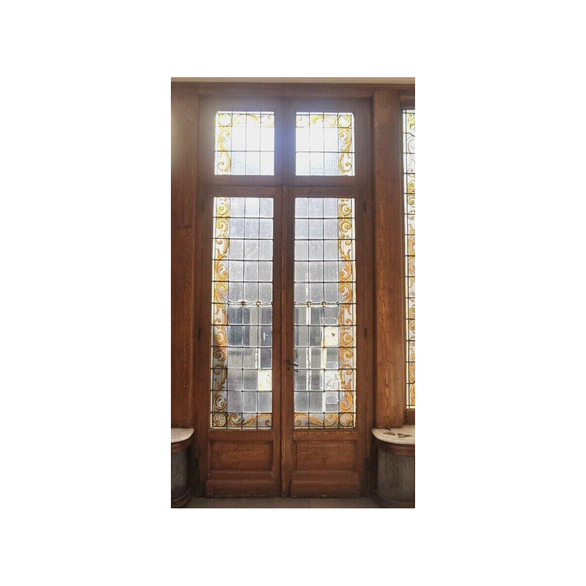 Verrière verticale en verre peint à l’imitation du vitrail.