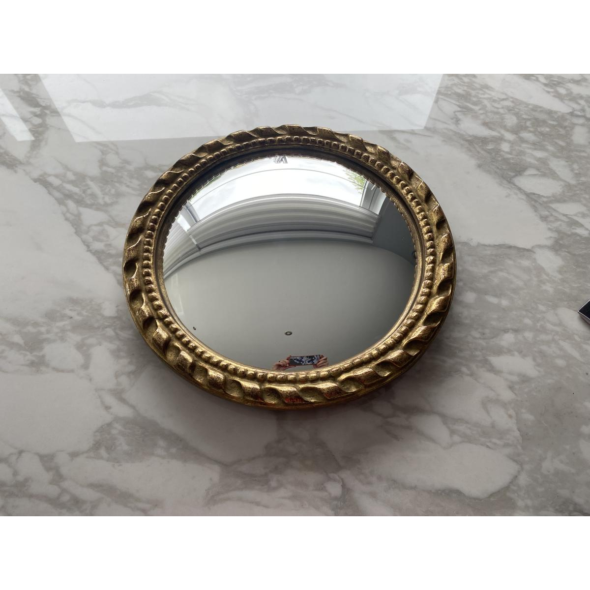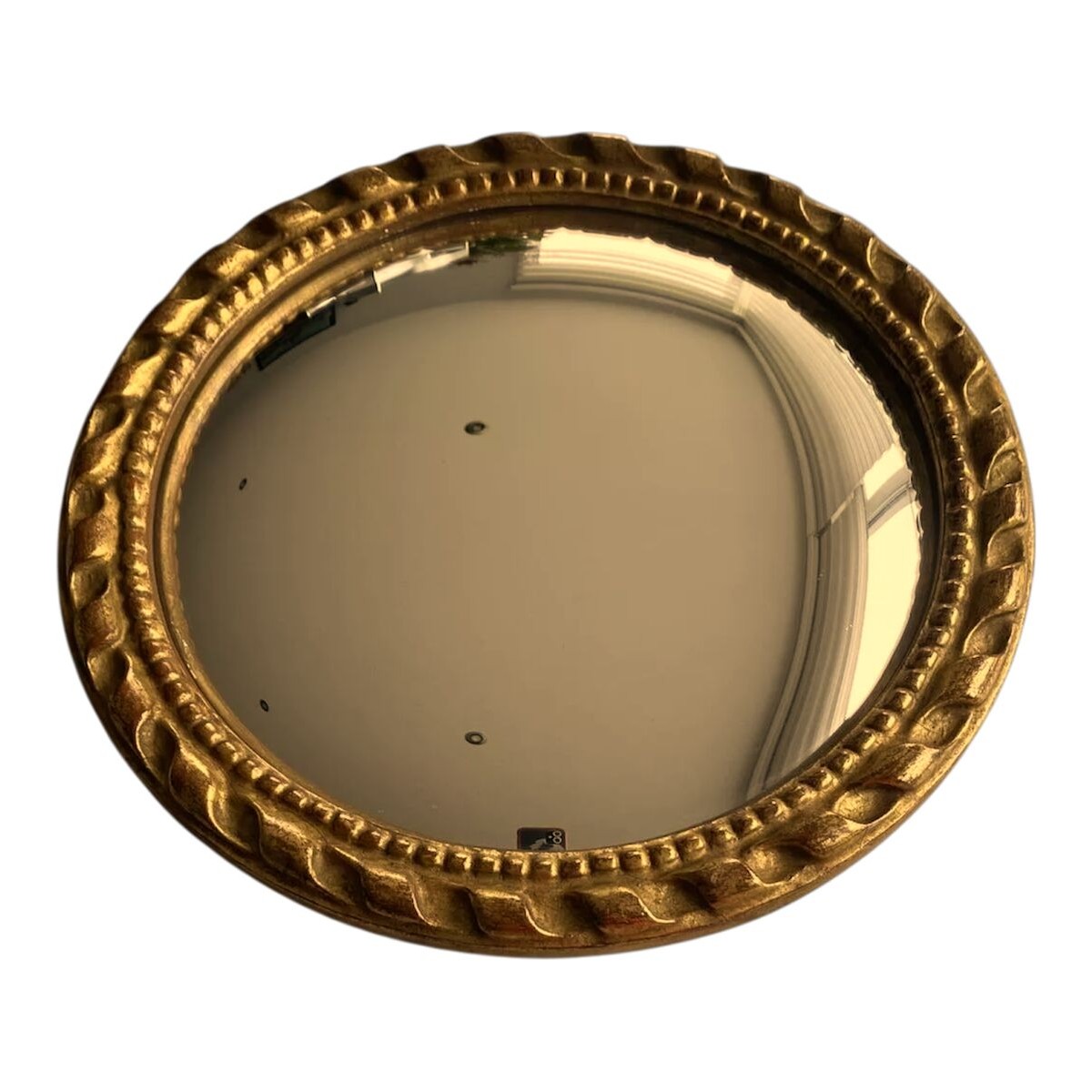 Miroir circulaire, bombé, garni d'un cadre en bois doré, sculpté. Sobre et très décoratif.