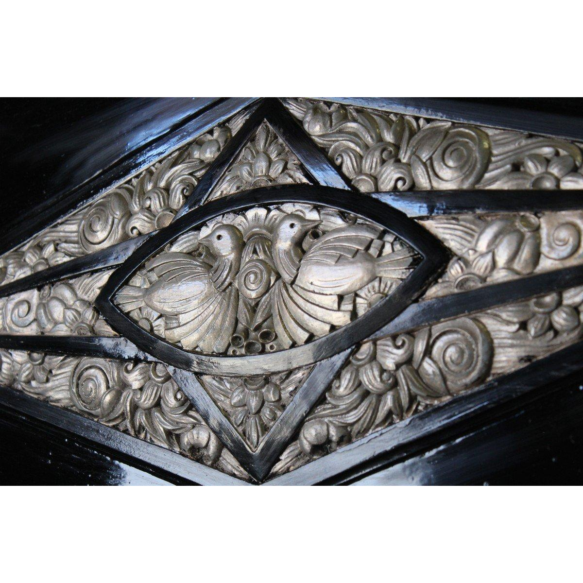 Vernis à la gomme laque d'origine noire avec ornements en bois et stuc patiné argent.