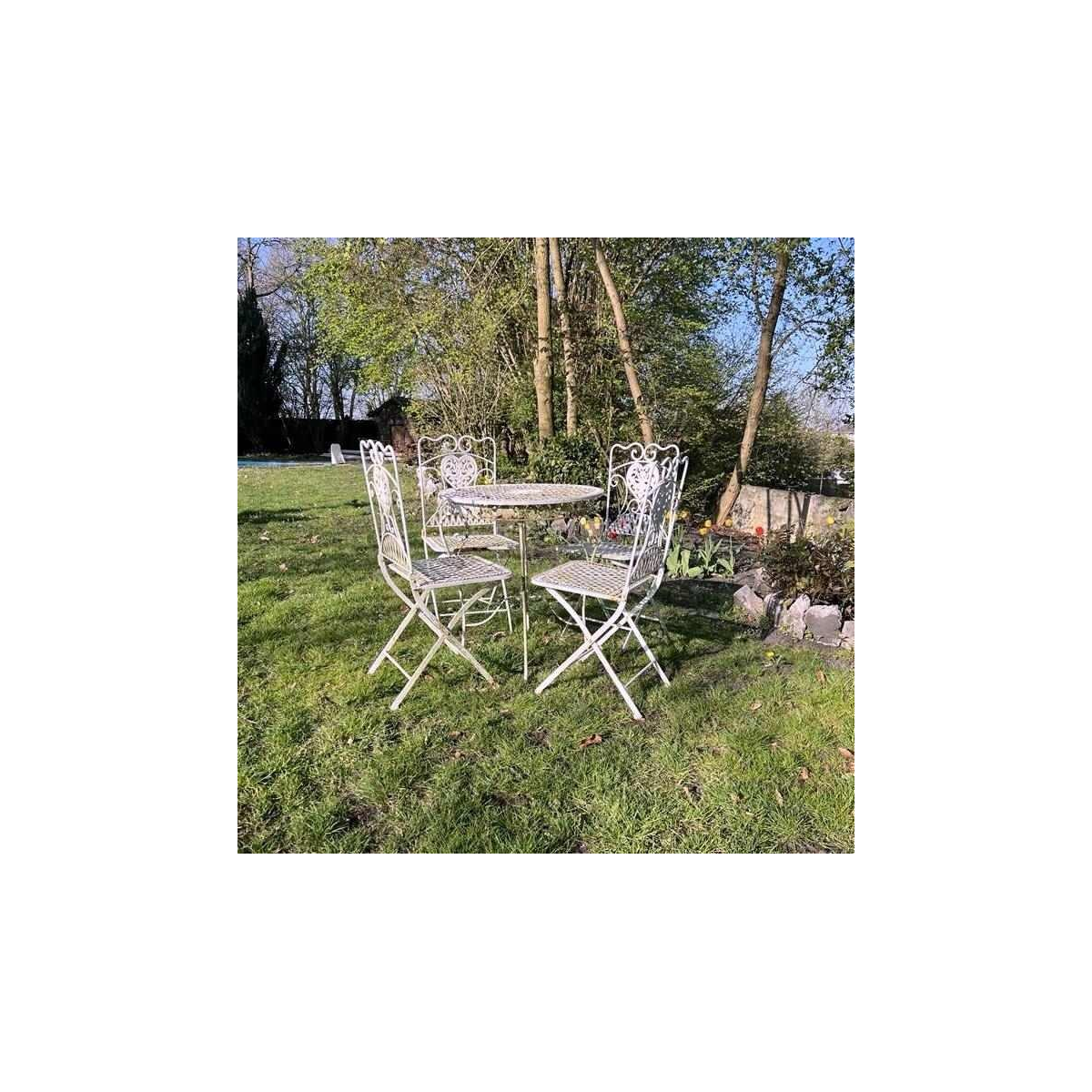 Ensemble composé d'une table et de 4 chaises pliantes en fer forgé peint blanc.