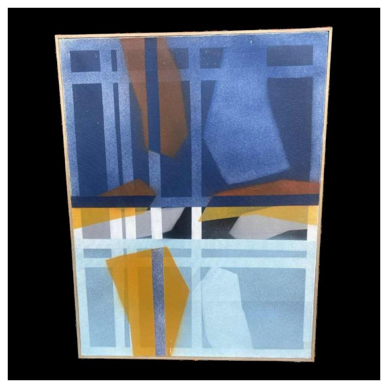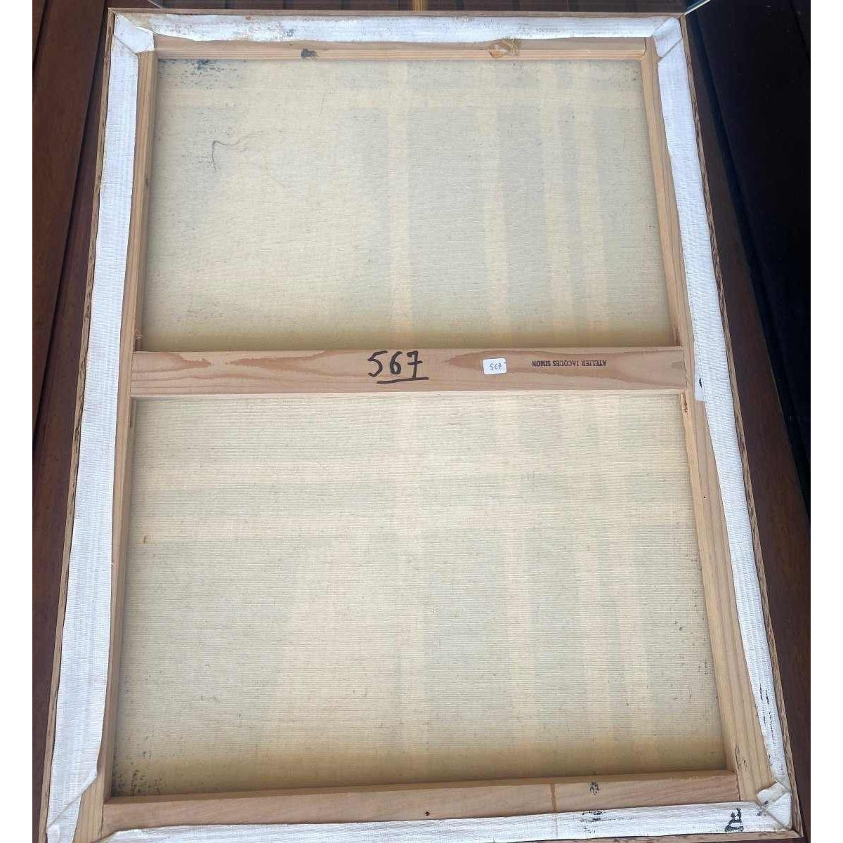 Tableau abstrait de Jacques Simon huile sur toile 1960. Jacques Simon est né en 1942 et est mort en 1995. Il fut très influencé et inspiré par son père Louis Maurice Simon (1905-1952 ) qui était instituteur public et peintre. A l'âge de 20 ans il entreprit des études artistiques à l'école des Beaux Arts de Rennes et les poursuivit à celle de Nantes. Après l'obtention de son diplôme, Jacques Simon opta pour l'enseignement des arts plastiques. Au lycée Mendes-France de la Roche sur Yon, il accomplit la majeure partie de sa carrière, mais on le vit aussi à Mulhouse, Fontenay le Comte et au Château d'Olonne. Convaincu par les réalisations de Le Corbusier, Simon envisageait une pratique artistique dans la ville, proche du quotidien. Il a fait des énormes projets muraux et beaucoup de toiles des années 70 sont à mettre en rapport avec ces projets muraux. Il se trouve dans plusieurs musées dont celui qui se trouve au Sable D'olonne qui se nomme L'Abbaye Saint-Croix.