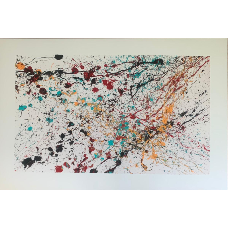 Depuis un an et demi, Judel développe une pratique du dripping aussi libre que réfléchie. Armé de sa palette et de ses pots de peinture, il compose de grandes toiles (souvent d’un mètre ou plus), délimitées par un cadre au scotch de masquage — signature graphique qui structure l’énergie de ses projections. Son geste s’est affiné au fil du temps : là où il traçait autrefois des lignes directes, il privilégie aujourd’hui des éclaboussures maîtrisées, riches et vibrantes.
