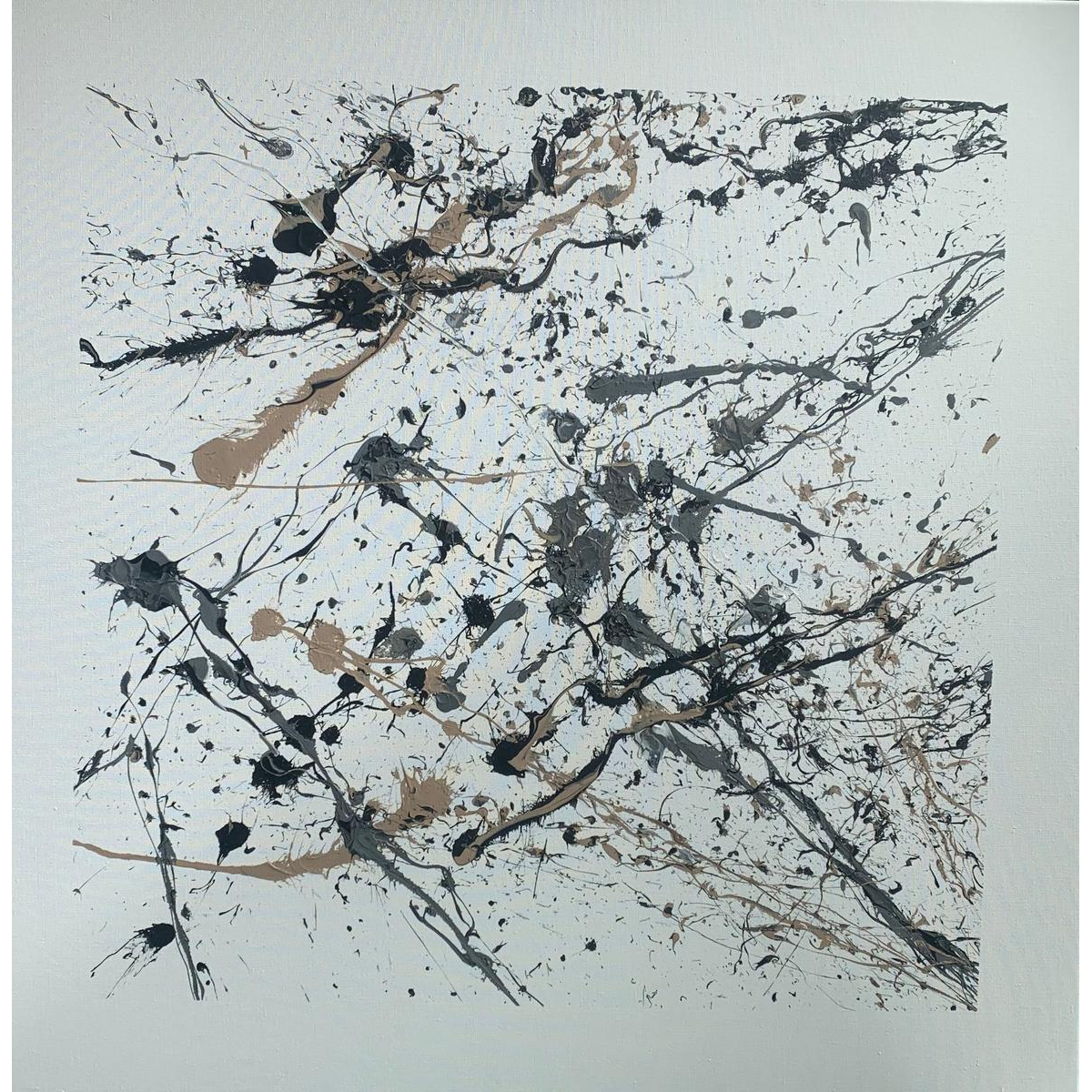 Depuis un an et demi, Judel développe une pratique du dripping aussi libre que réfléchie. Armé de sa palette et de ses pots de peinture, il compose de grandes toiles (souvent d’un mètre ou plus), délimitées par un cadre au scotch de masquage — signature graphique qui structure l’énergie de ses projections. Son geste s’est affiné au fil du temps : là où il traçait autrefois des lignes directes, il privilégie aujourd’hui des éclaboussures maîtrisées, riches et vibrantes.