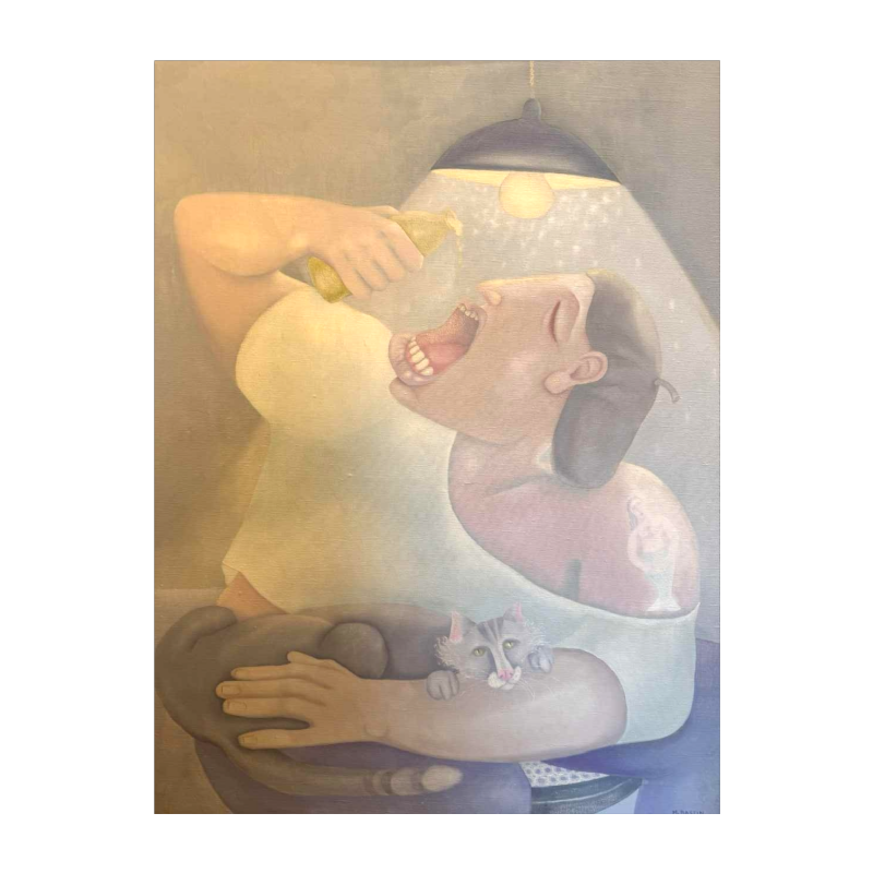 Mireille BASTIN « le buveur de bière et son chat » peinture huile sur toile