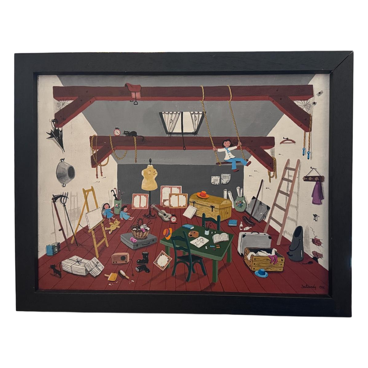 Marie-Louise BATARDY «Au grenier» 1976 peinture sur toile.