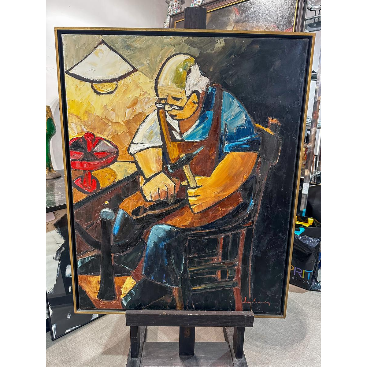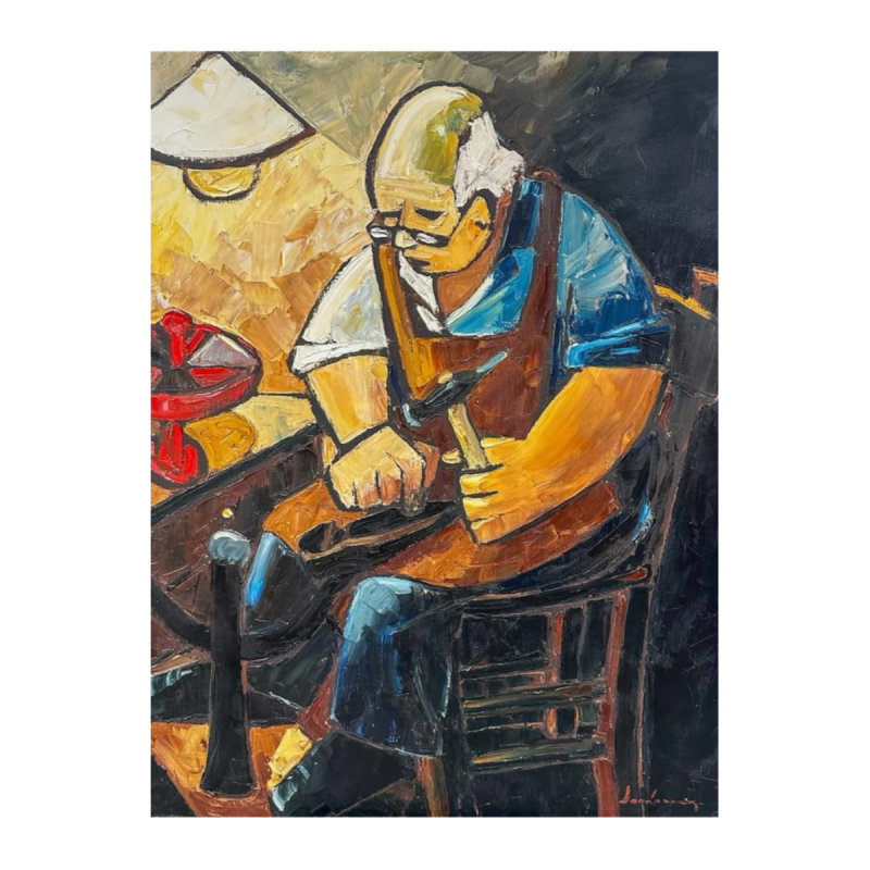 Ce formulaire permet uniquement de nous faire part d'un contenu illicite sur le produit : Milo Dardenne, "Le Coordonnier", huile sur toile, 20e siècle.