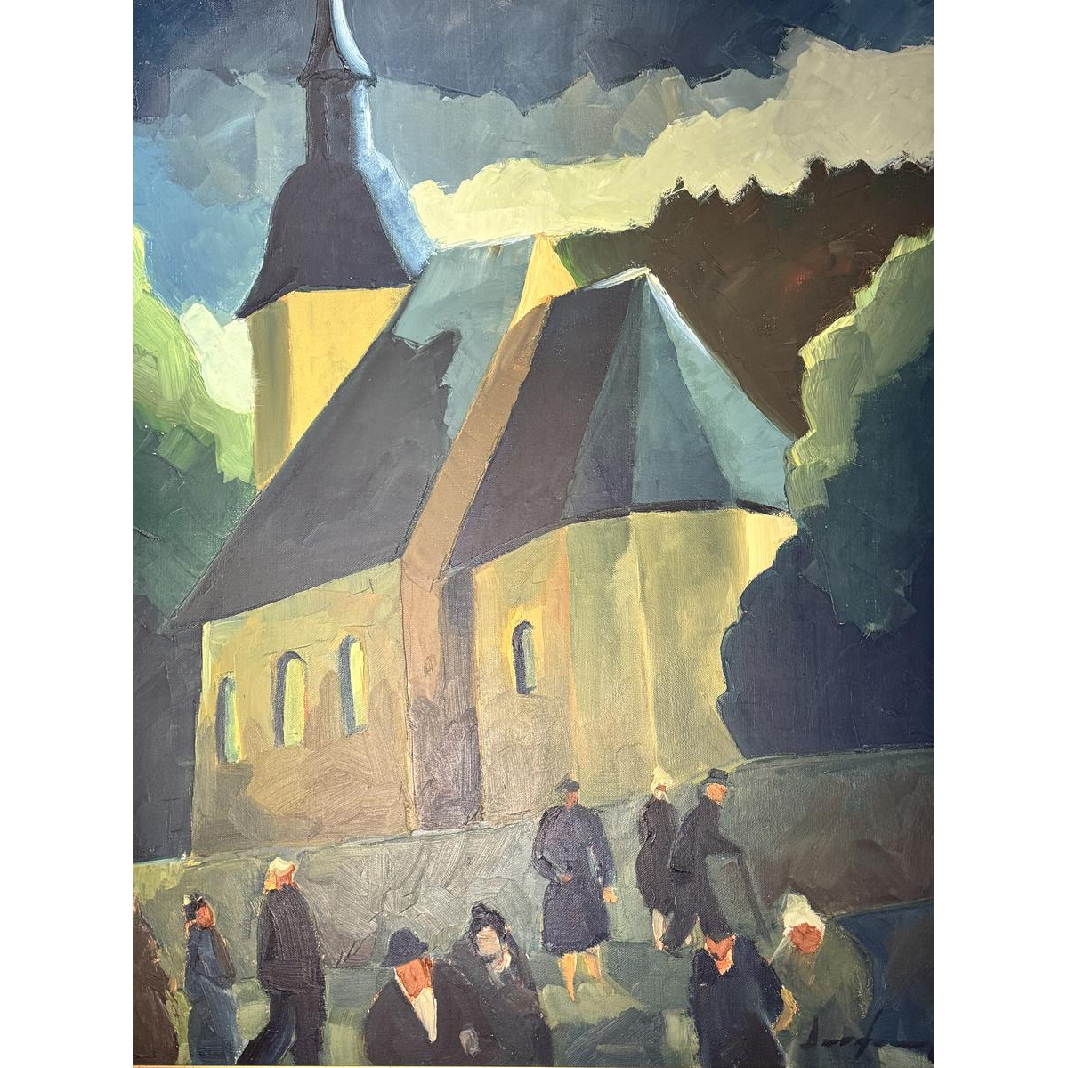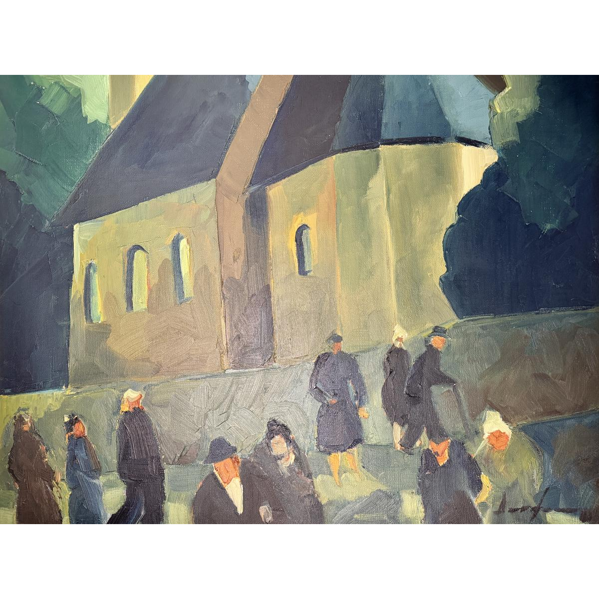 Milo DARDENNE «Paroissiens à la sortie de l’Eglise Saint Pierre de Jamoigne?» peinture huile sur toile