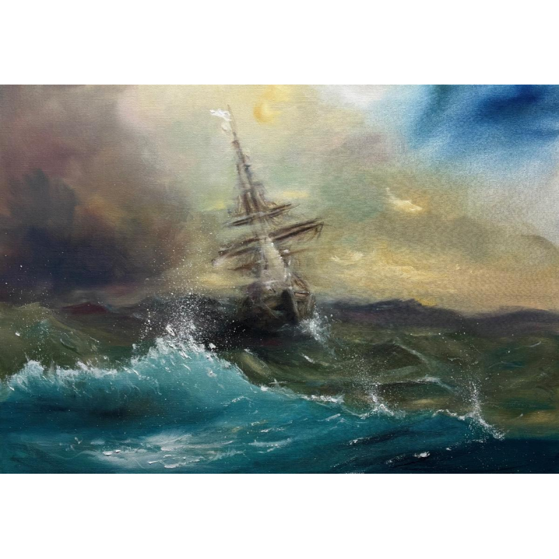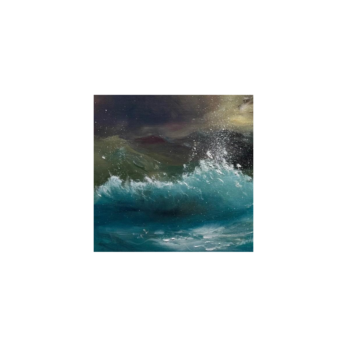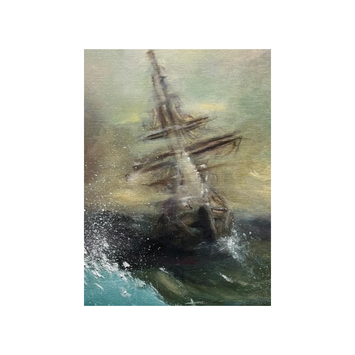 "Un navire s’avance dans une mer tourmentée, porté par une lumière dorée qui perce le ciel. La vague au premier plan ouvre un passage entre tension et espoir."