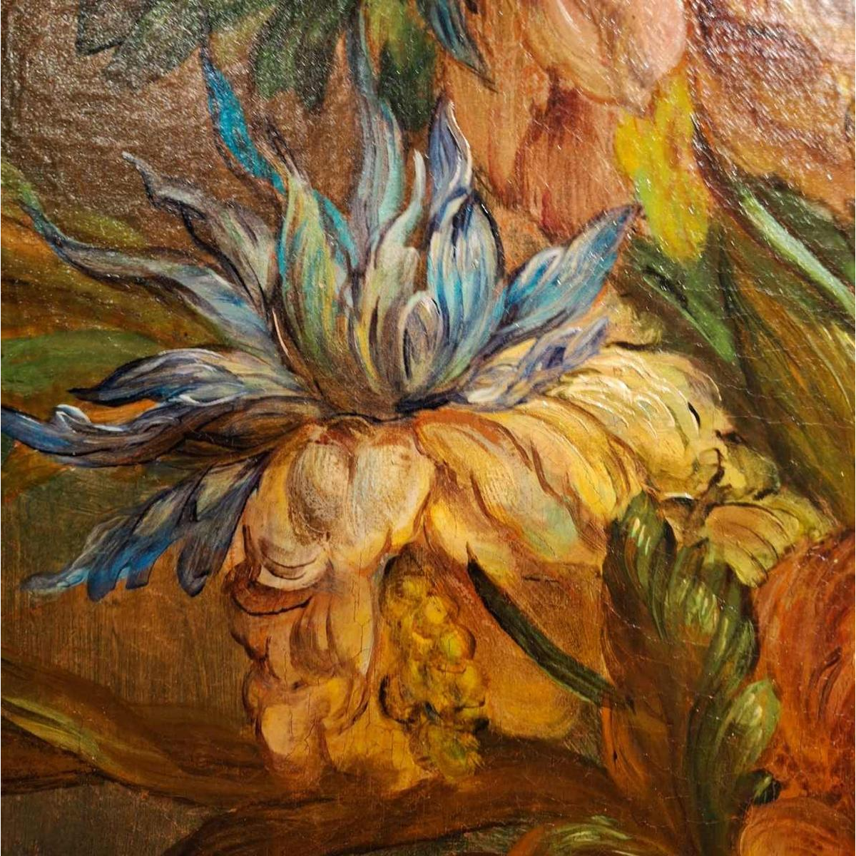 Peinture décorative du XIXe siècle représentant un cacatoès et un faucon s'attaquant l'un l'autre devant un vase ornemental rempli de fleurs, dans un paysage idyllique.