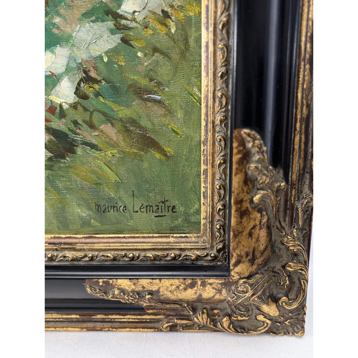 L'oeuvre est signée en bas à droite "Maurice Lemaitre" artiste français du XXe siècle, connu pour ses paysages sensibles et construits, inscrits dans la tradition modernisée de la peinture de plein air. Le tableau est présenté dans un important cadre en bois sculpté peint et doré.