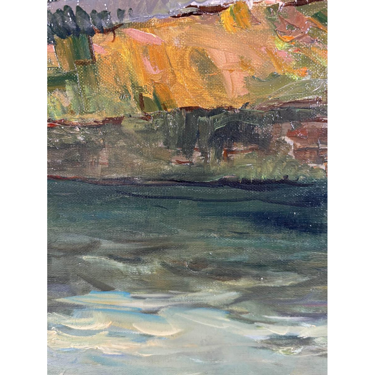 La touche est libre, épaisse et très expressive, travaillée au couteau et au pinceau, avec une matière généreuse particulièrement visible dans les zones végétales et les maçonneries.