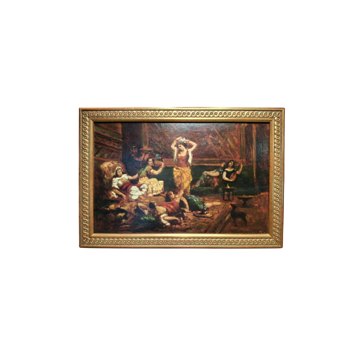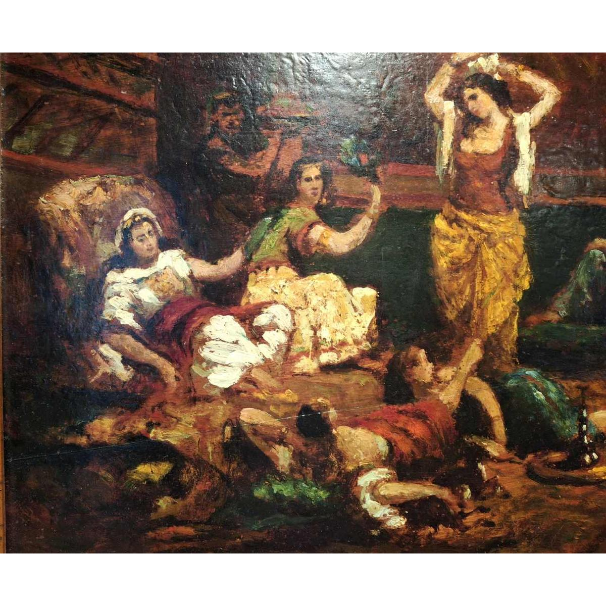 Le tableau orientaliste représente un harem. Peint avec des couleurs chaudes et un pinceau épais.