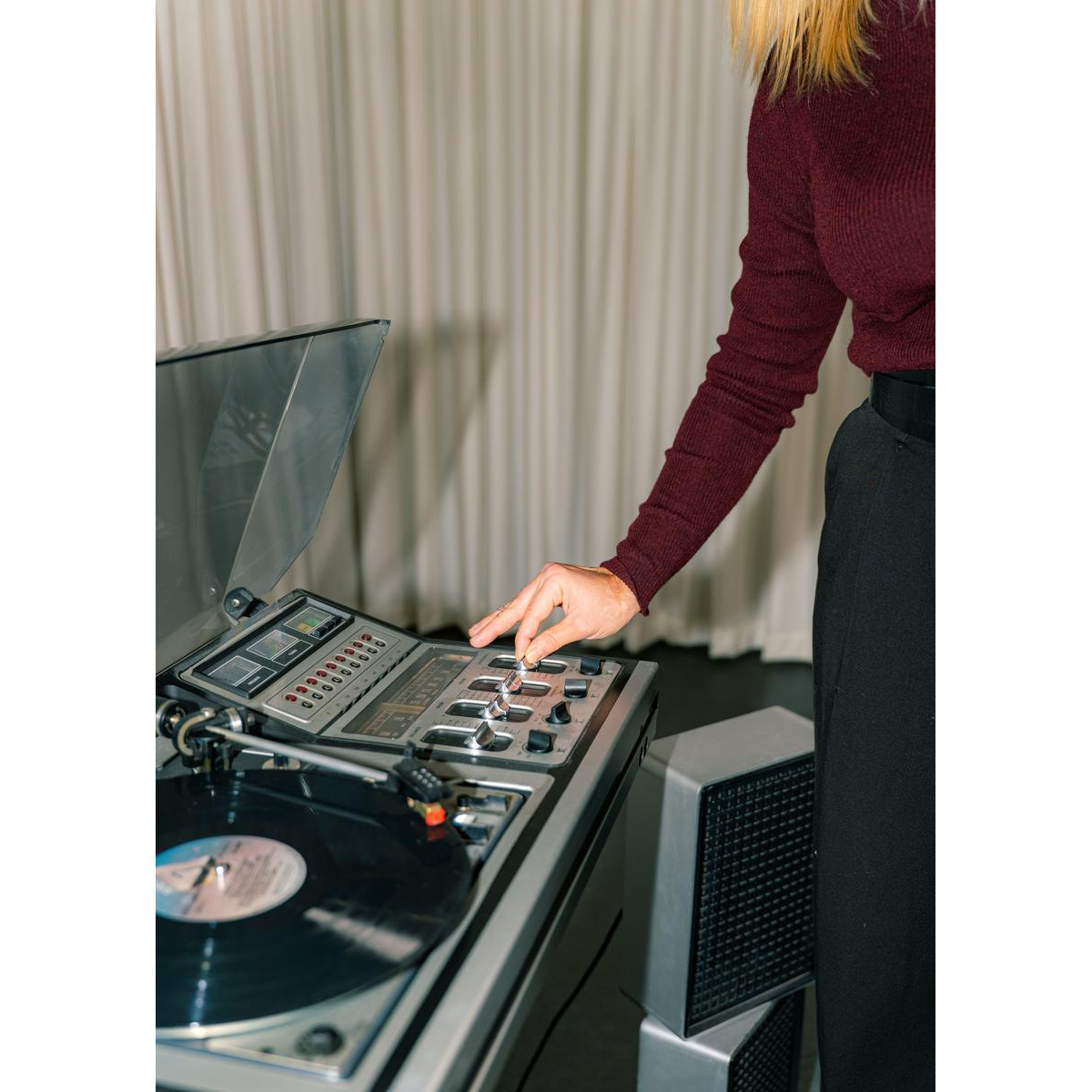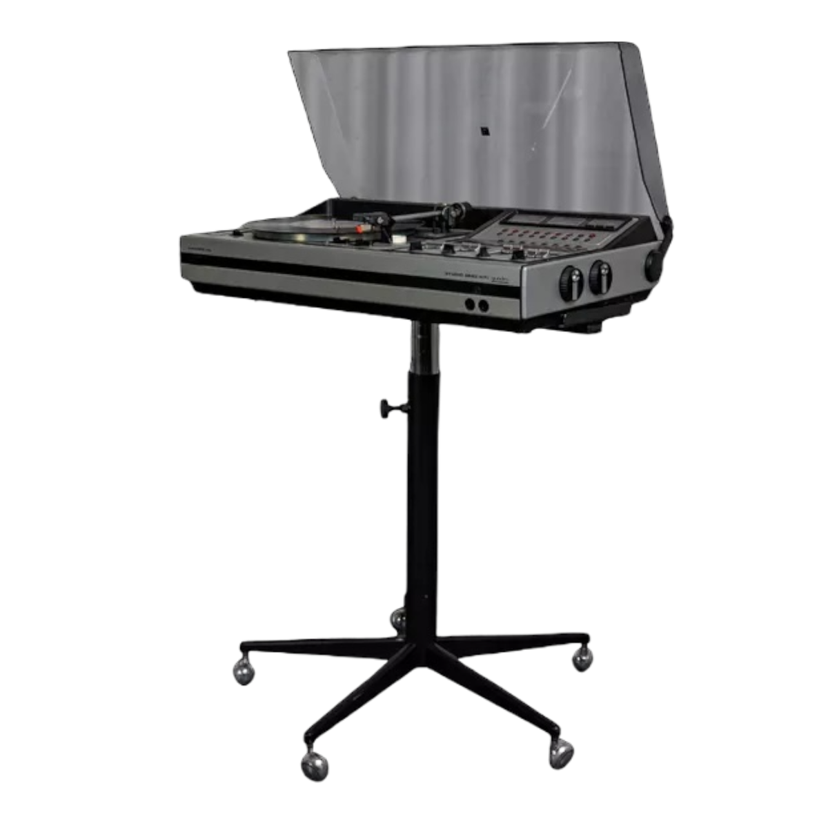 Ce studio Hi Fi est vendu avec un pied en étoile sur roulette et est en bon état de fonctionnement. Cette pièce présente des traces d'usures et une patine liées à l'âge et à l'usage comme notamment des griffes sur le capot en plastique.