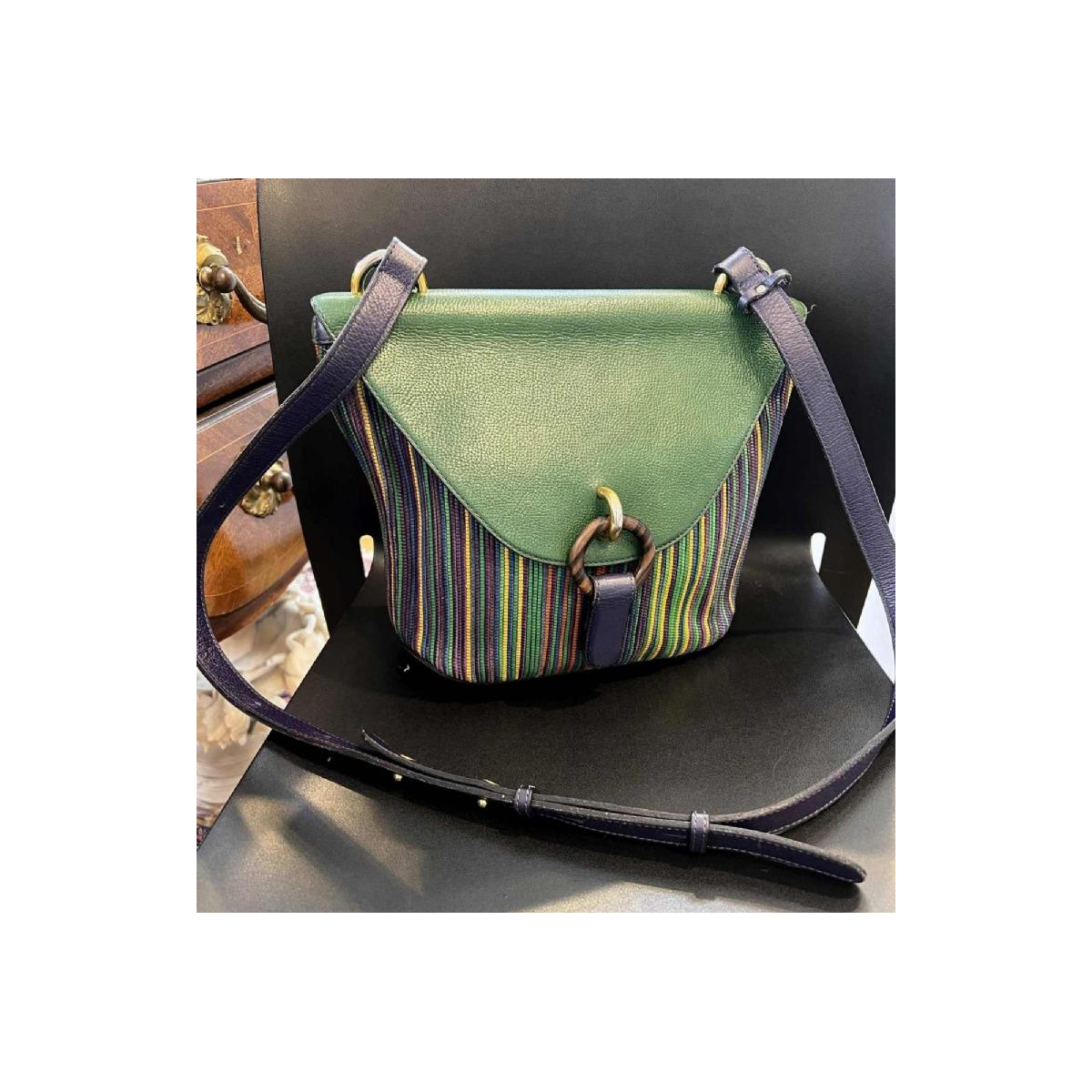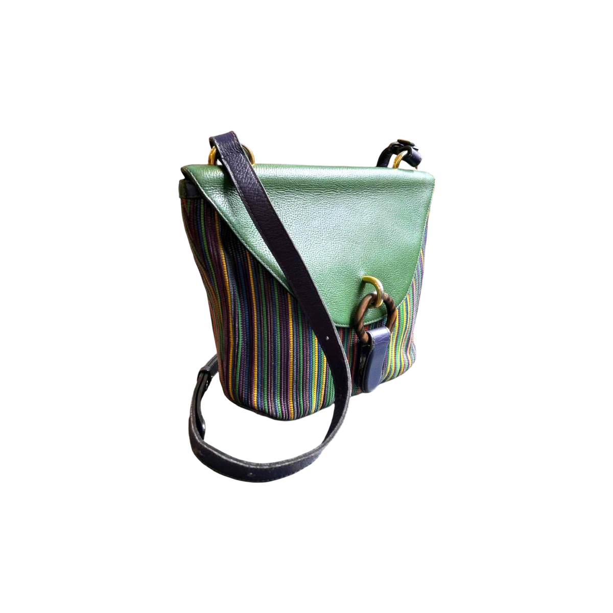 Sac en cuir tressé multicolore et grainé vert/bleu.
