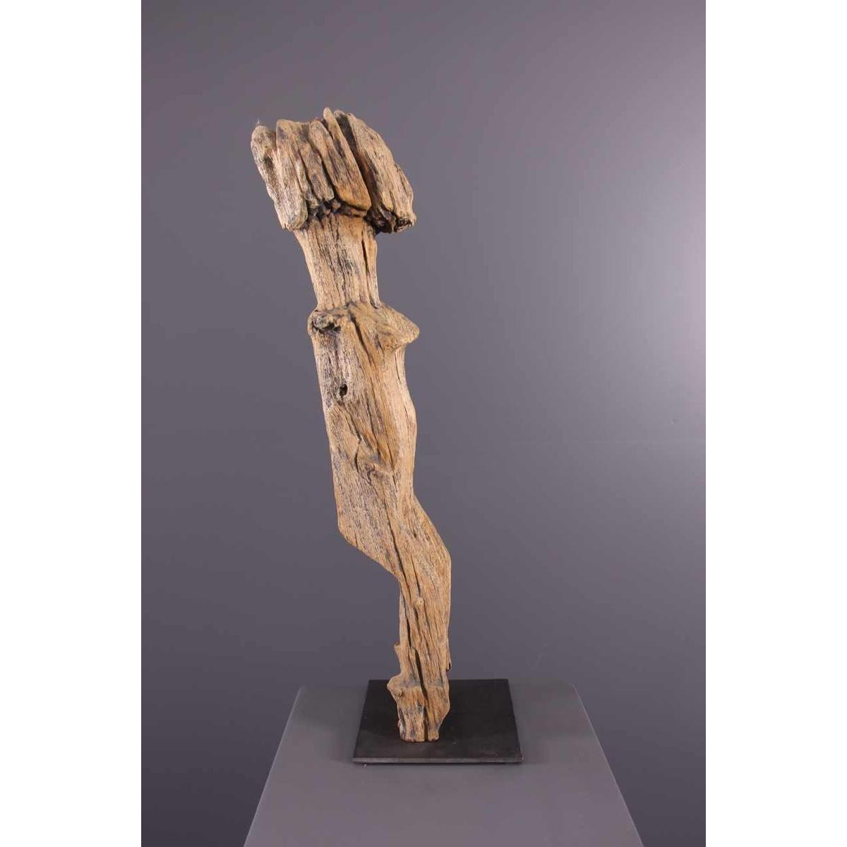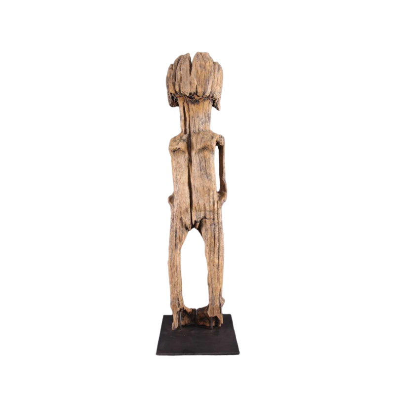 Les statues d'ancêtres sont généralement représentées de face, avec un buste droit et rigide. L'usure du temps, sous l'effet du vent, du sel et du sable, a altéré ces sculptures, creusant et fissurant le bois, ce qui a donné à la matière une texture sèche et particulière, ainsi qu'une patine claire d'une matité distinctive.