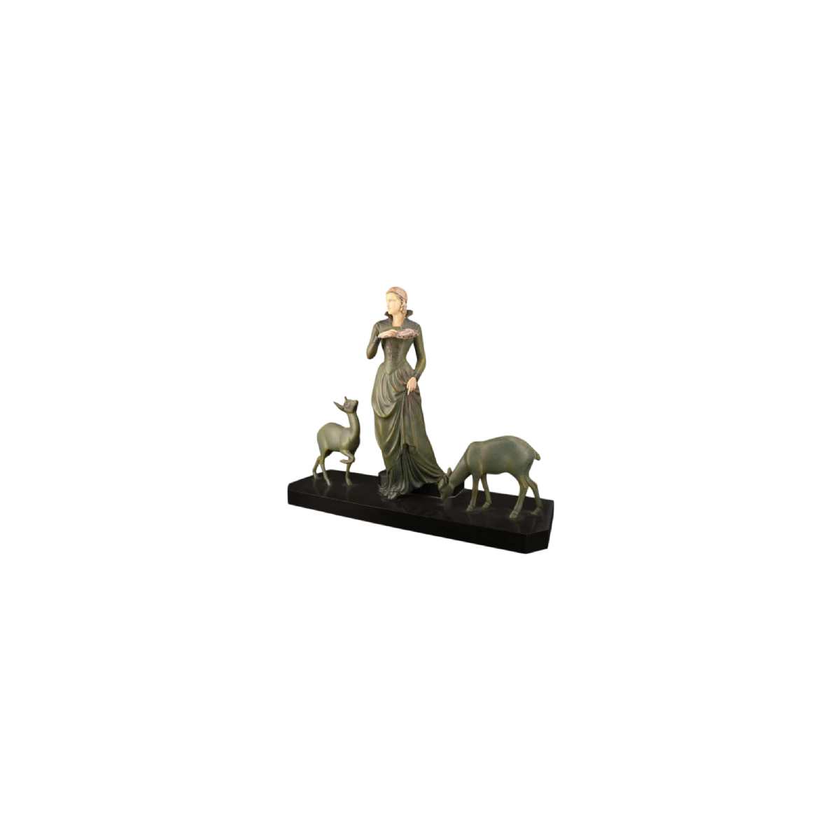Les biches, de part et d'autre, sont représentées avec des lignes épurées : l'une lève la tête vers la femme, l'autre est penchée. Leurs corps élancés reflètent l'esthétique stylisée de l'époque. Le tout repose sur un socle en marbre noir, sobre et géométrique, typique de l'Art déco.