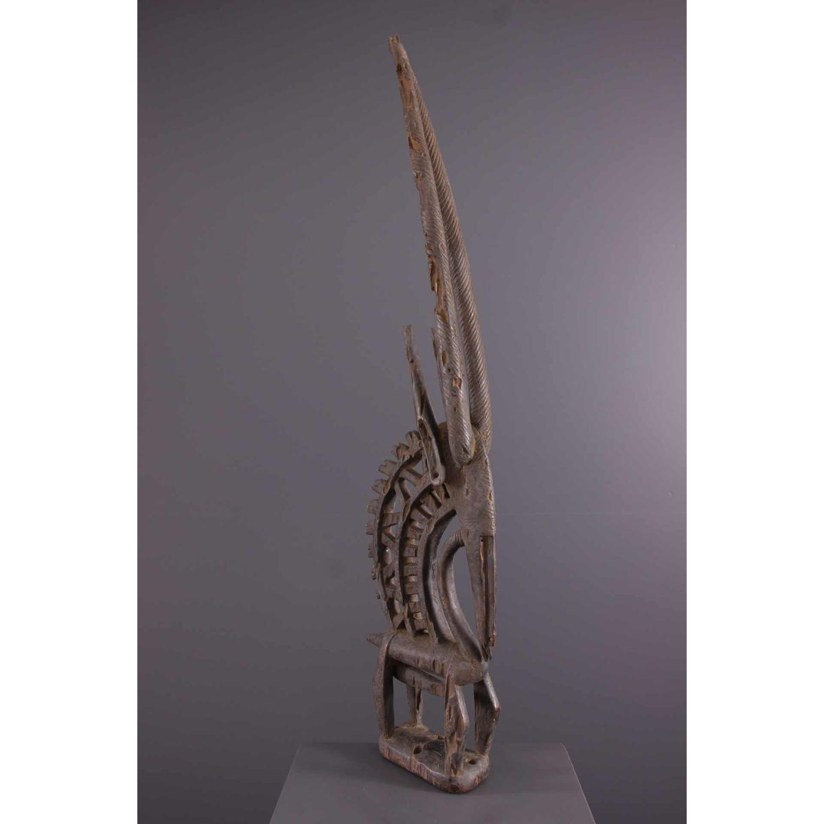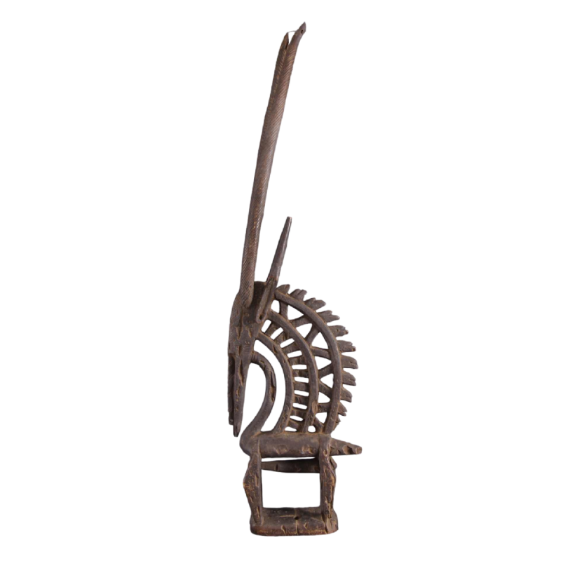 Dans le centre et le sud du Mali, cette sculpture représente le Ciwara, une créature mi-antilope, mi-cheval, également appelée "fauve de la terre". Pour les Bambara, aussi connus sous le nom de "Bamana", souvent qualifiés d'"incroyants" par les musulmans, cette figure mythique aurait enseigné l'agriculture à l'humanité et offert la première céréale. Le cimier, fixé au sommet du crâne à l'aide d'un chapeau en vannerie maintenu par des liens en raphia, accompagnait les danseurs lors des rituels du tòn, une association dédiée aux travaux agricoles. Ces masques sautaient à travers les champs pour chasser les nyama, des forces maléfiques, détecter les dangers et débusquer les esprits malveillants qui pourraient voler l'âme des plantes cultivées et la vitalité de leurs graines.