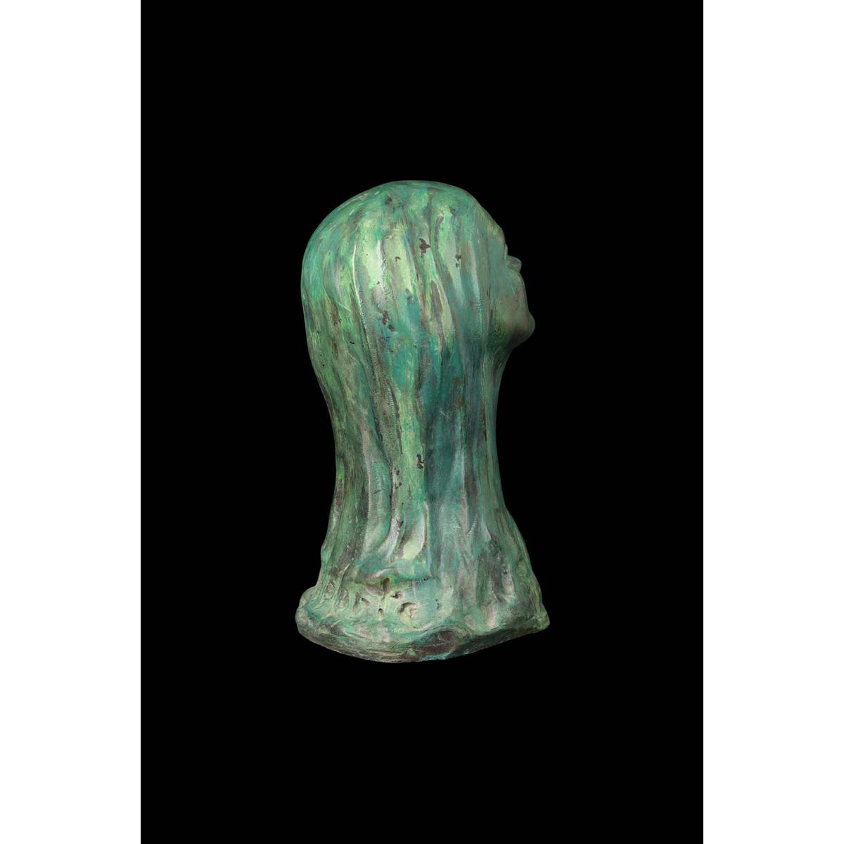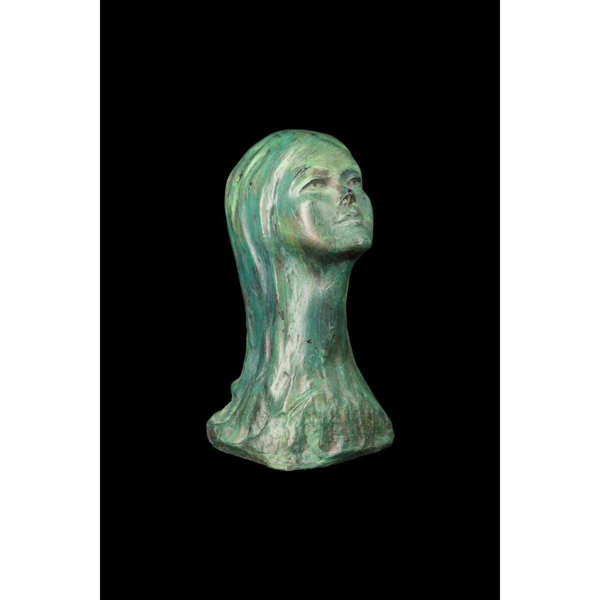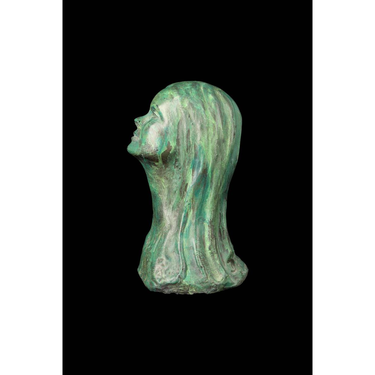Ce buste en matériaux composites représente une jeune femme au visage tourné vers le ciel, exprimant une posture rêveuse ou contemplative. Les lignes douces de la sculpture, ainsi que la chevelure fluide se fondant dans le socle, évoquent une harmonie entre l'humain et le naturel. La patine verte renforce l'aspect onirique et intemporel de l'œuvre.