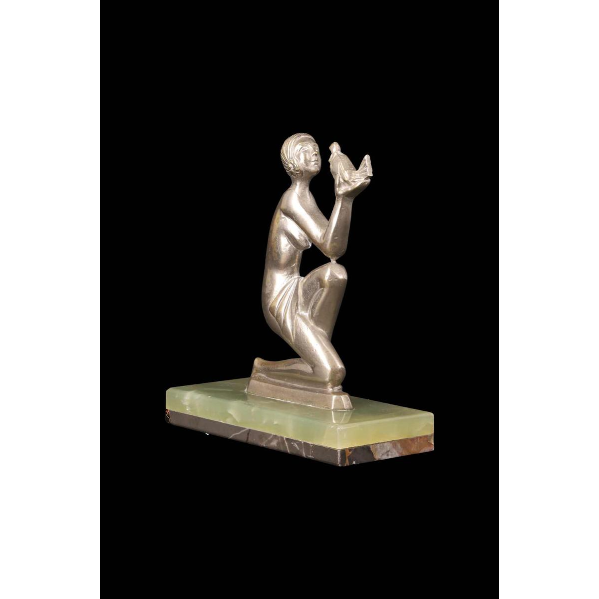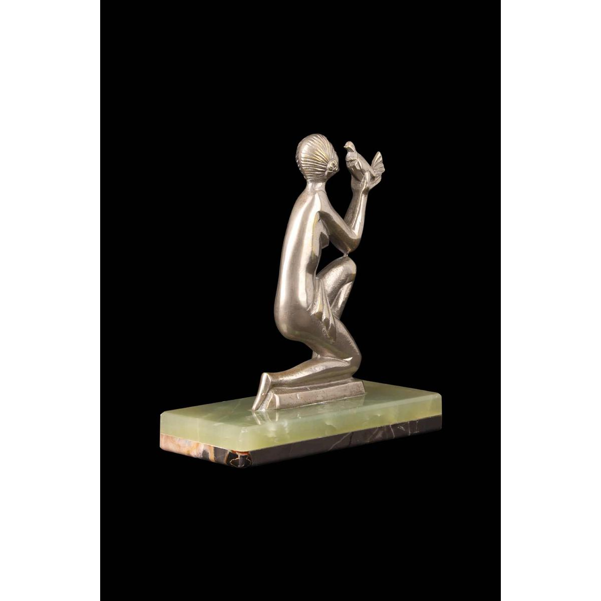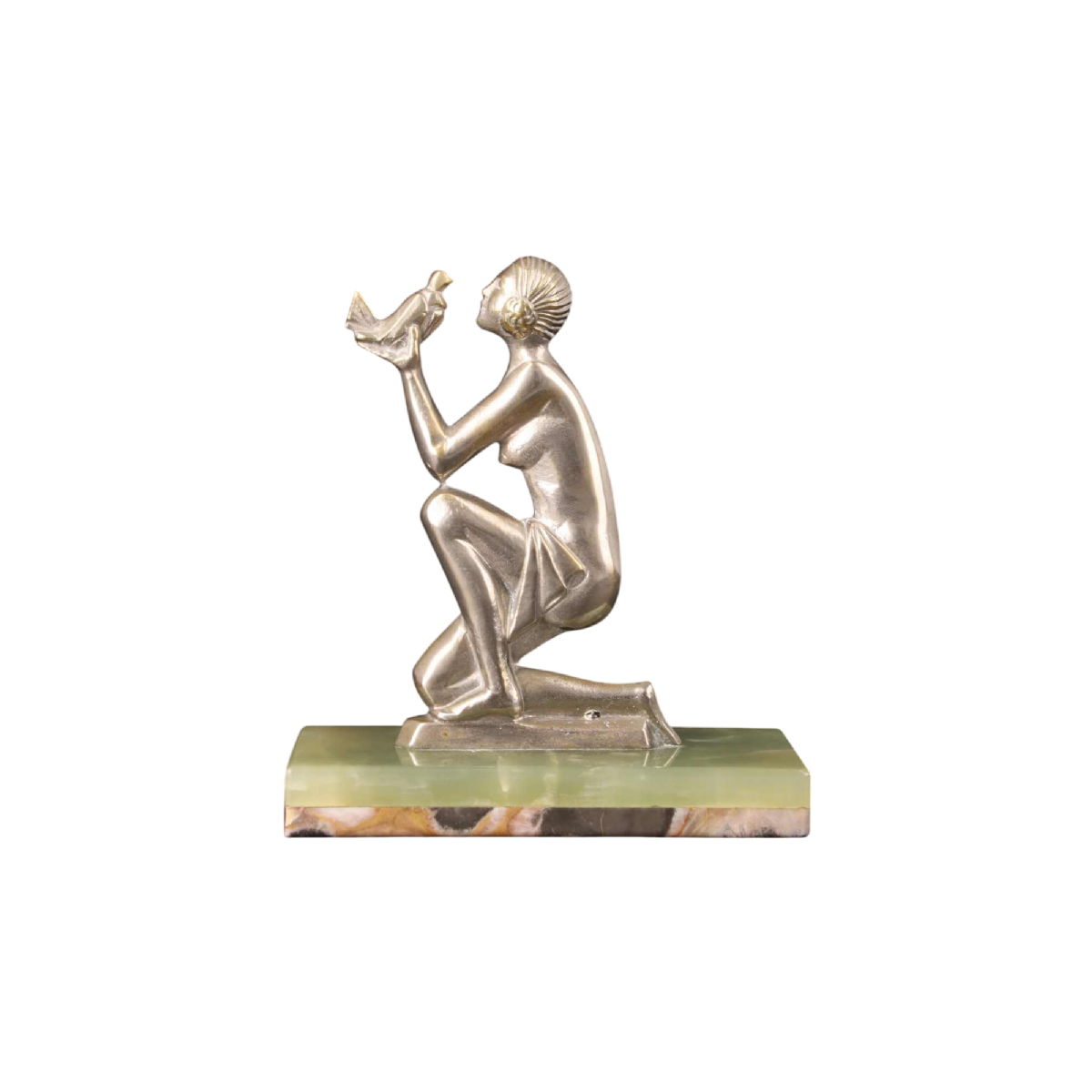 Cette petite sculpture représente une femme agenouillée, tenant dans ses mains un oiseau stylisé qu'elle observe avec tendresse. Réalisée en métal argenté ou régule nickelé, elle repose sur un socle en onyx vert pâle et marbre noir veiné. La femme est nue, à l'exception d'un léger drapé tombant sur sa cuisse. Sa coiffure, géométrique et plaquée, ainsi que ses boucles d'oreille évoquent une esthétique raffinée et stylisée. La posture élégante, la fluidité des formes et le poli de la matière renforcent l'élan poétique de la scène. L'expression de douceur et de légèreté s'accorde à la présence du volatile, symbole de paix ou de liberté.