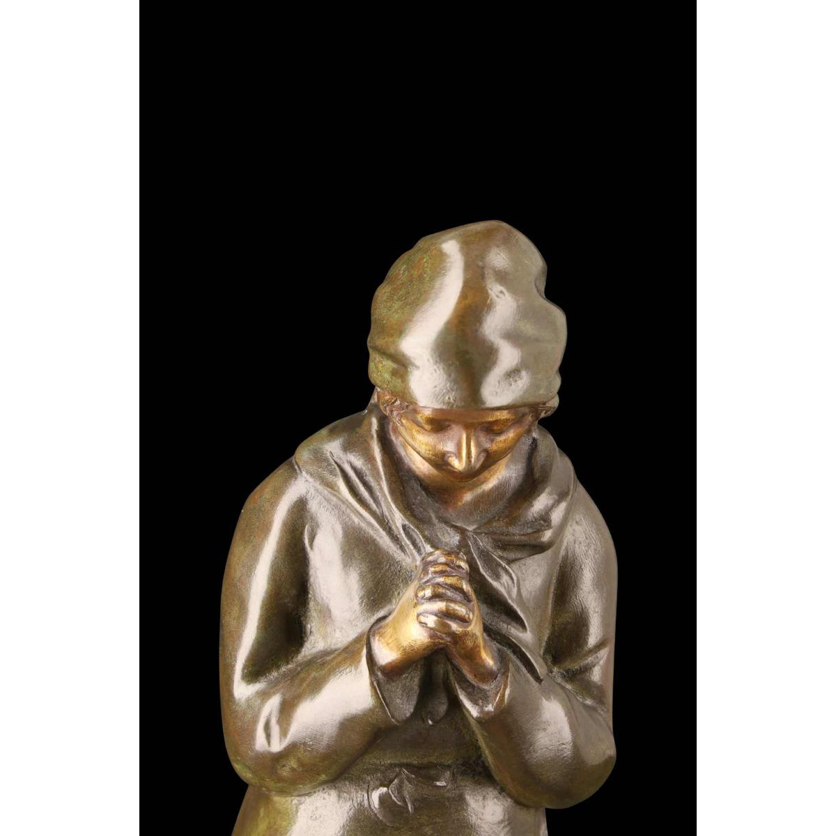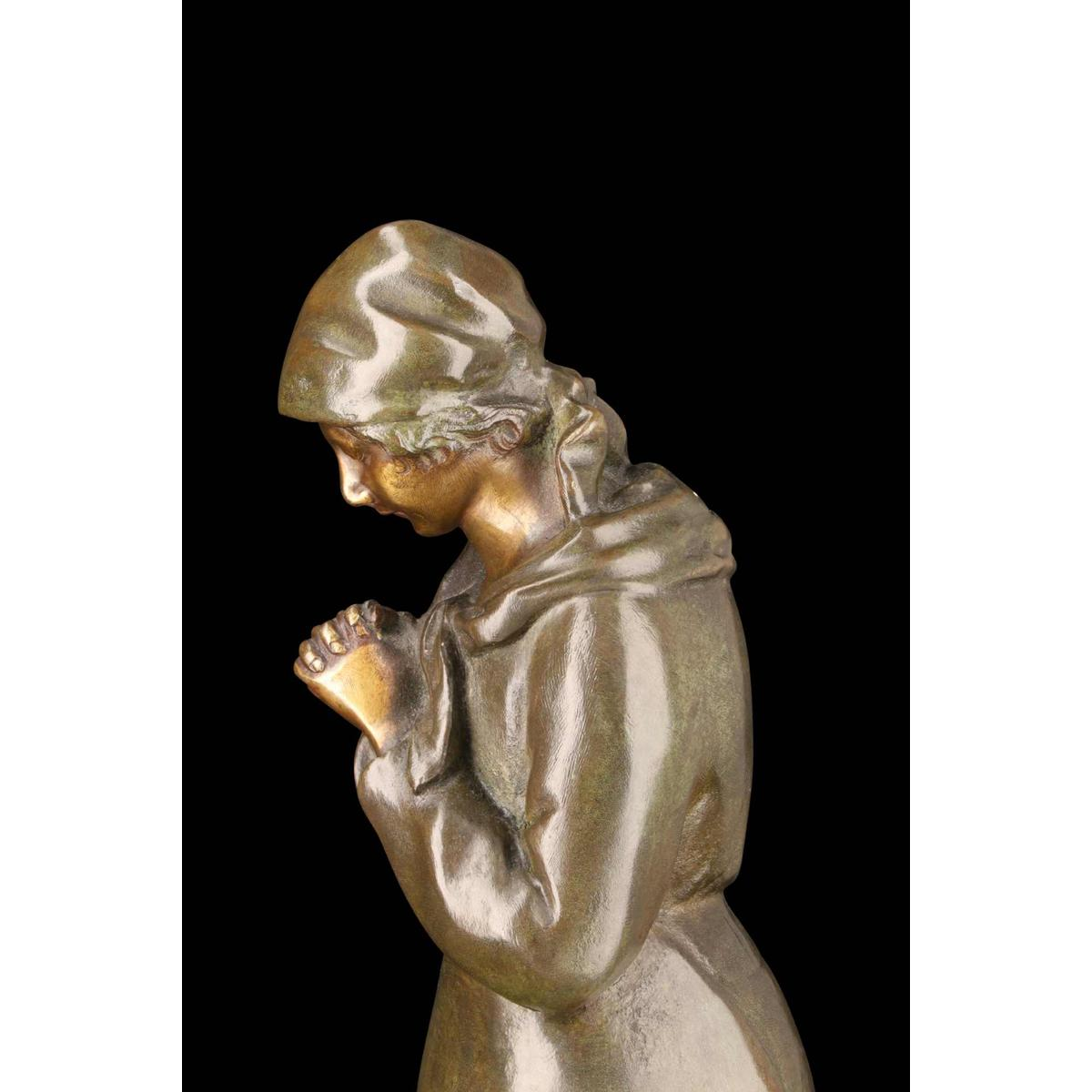 Cette sculpture en bronze, intitulée La Prieuse, représente une jeune femme en prière, les mains jointes et la tête légèrement inclinée, dans une posture de recueillement.