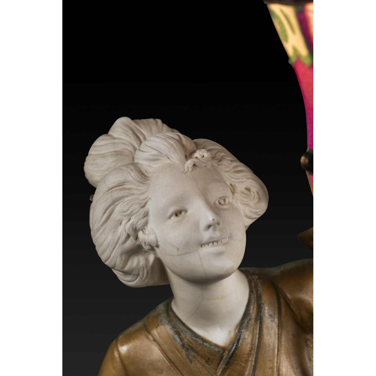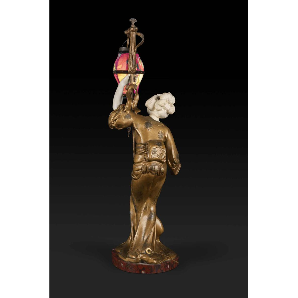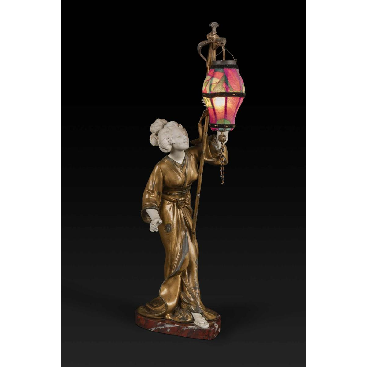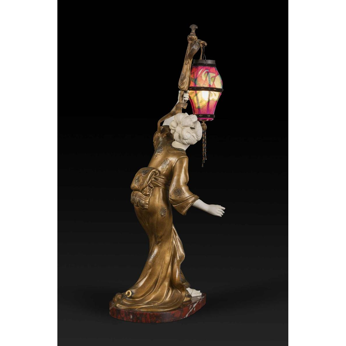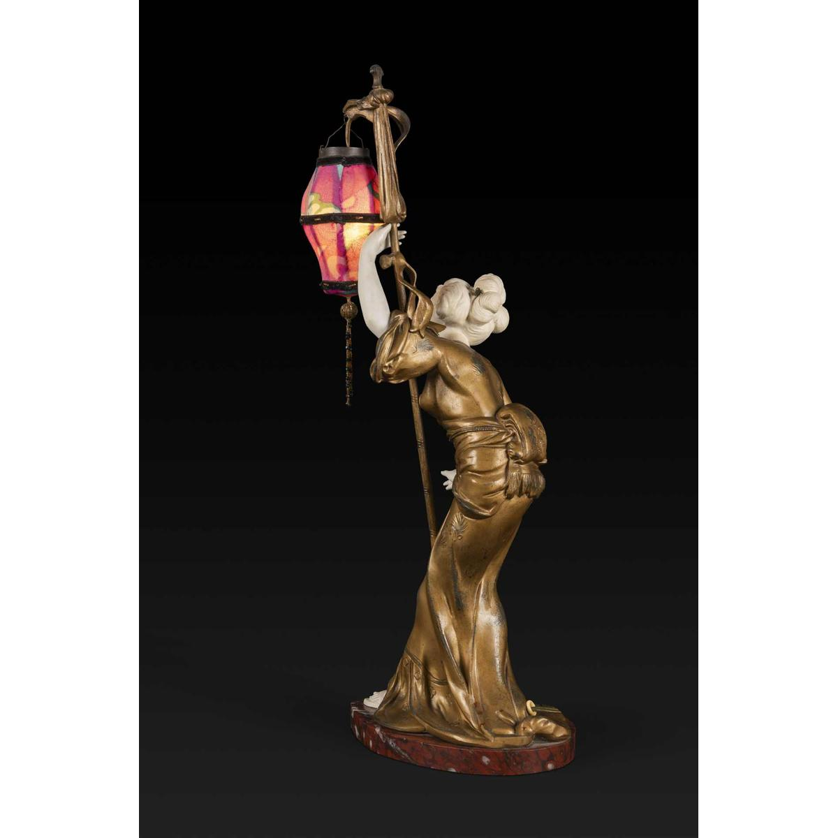 ADOLPHE ARMAND TRUFFIER «LA GEISHA AU LAMPION », statuette lampe, sculpture régule doré, biscuit de porcelaine