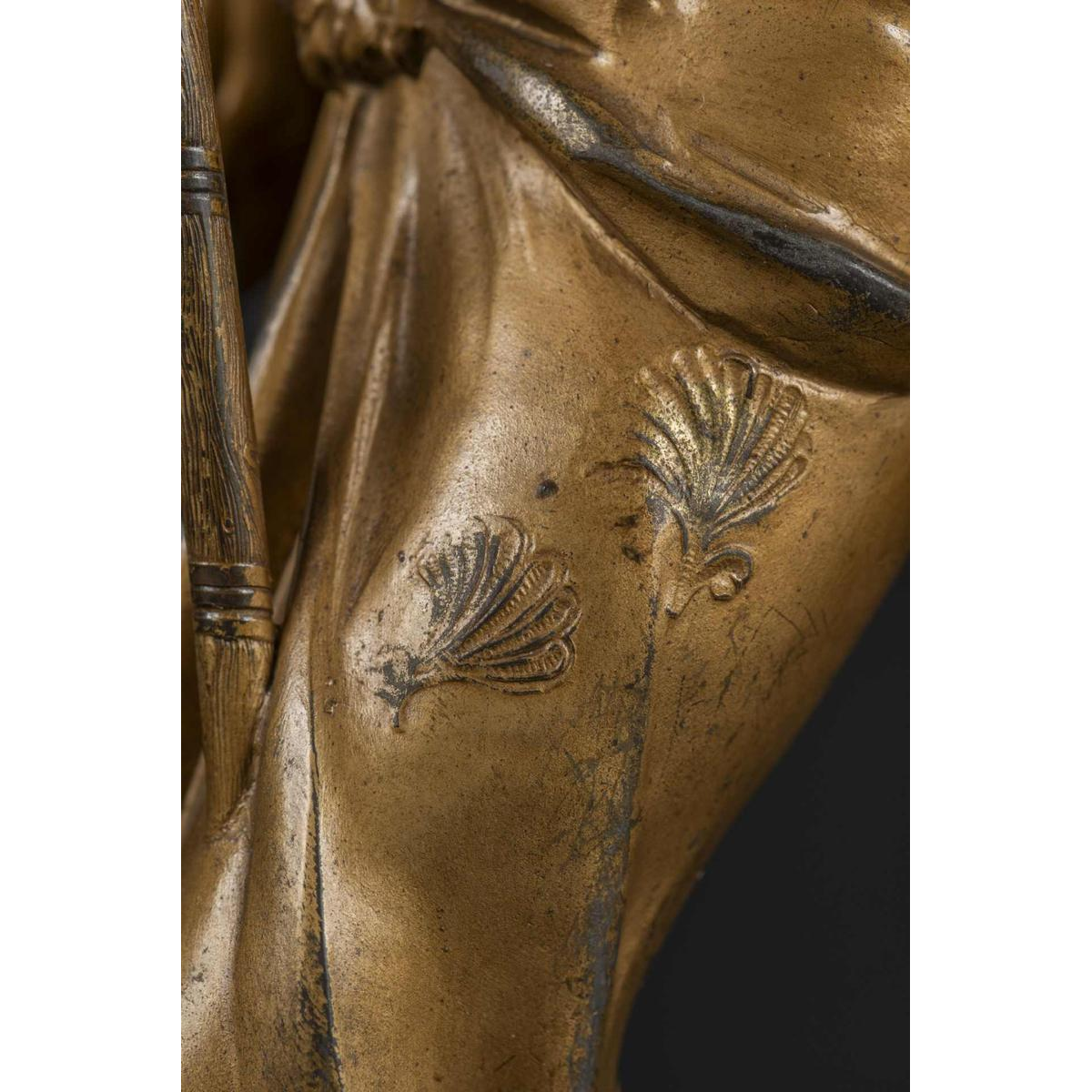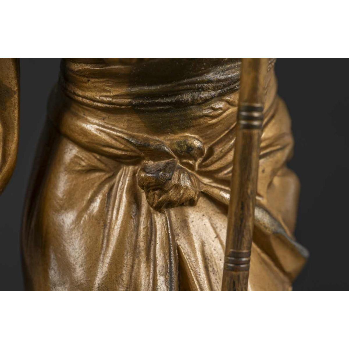 La sculpture est réalisée en régule doré et biscuit de porcelaine. Les pieds, les mains, les bras, ainsi que la tête et les masques de théâtre sont minutieusement façonnés en biscuit de porcelaine, évoquant le style délicat des œuvres chryséléphantines. Le kimono, drapé avec une finesse remarquable, est orné de gravures élaborées qui témoignent de l'excellence du travail artisanal.