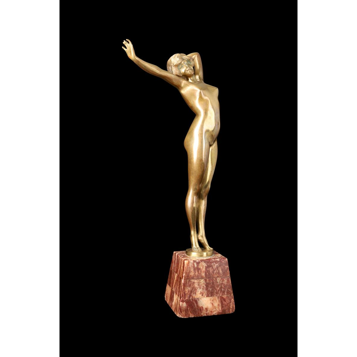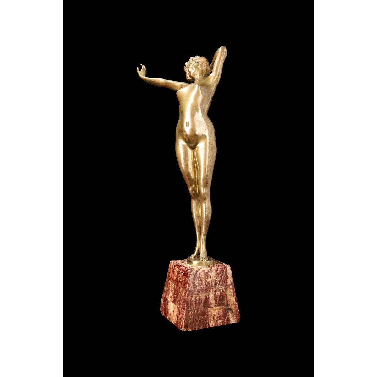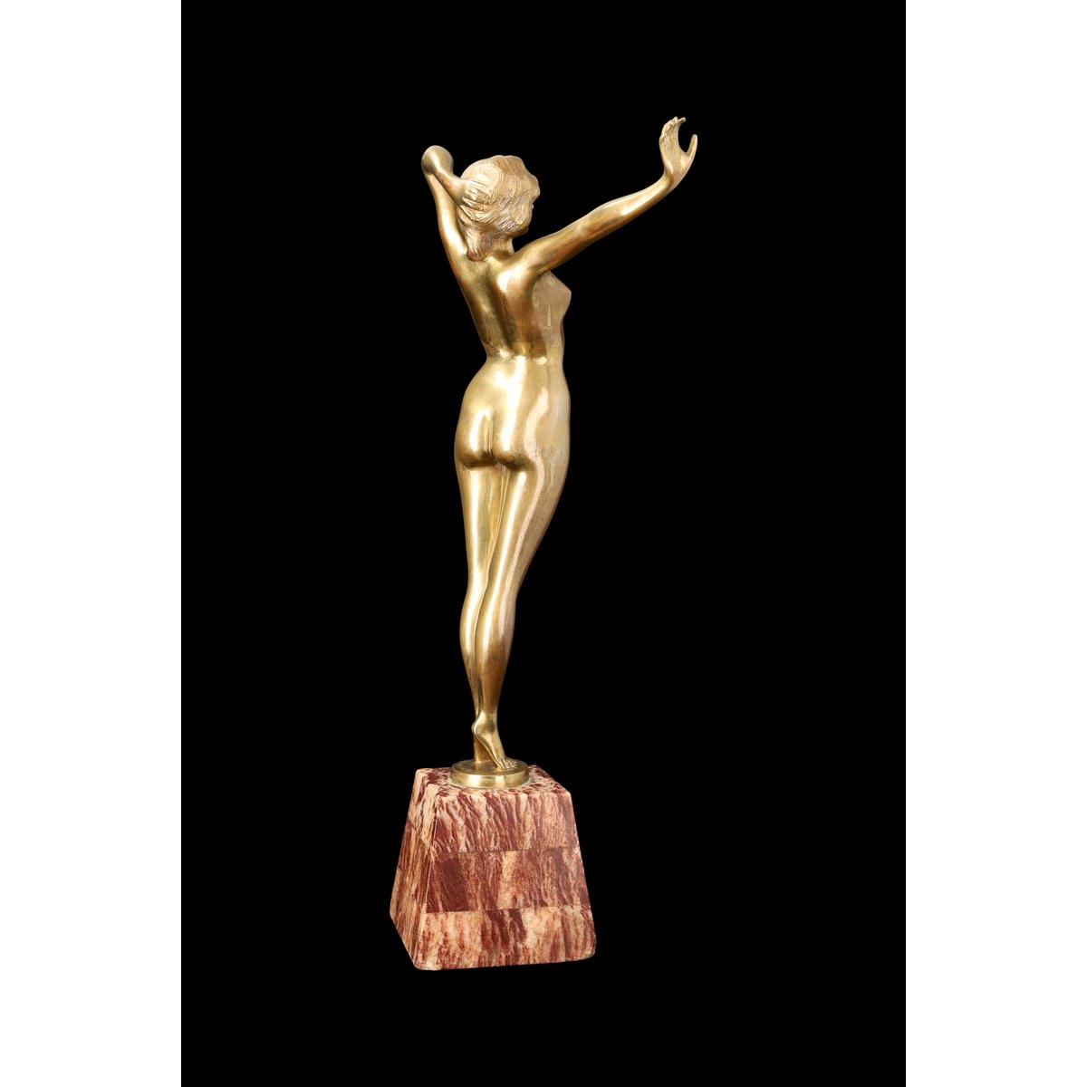 La sculpture est une figure féminine nue, réalisée en bronze à patine dorée ou mordorée (bronzée). Elle est montée sur un socle de forme trapézoïdale en marbre veiné (le marbre rouge-brun visible sur les photos). La femme est représentée dans une pose dynamique et expressive.