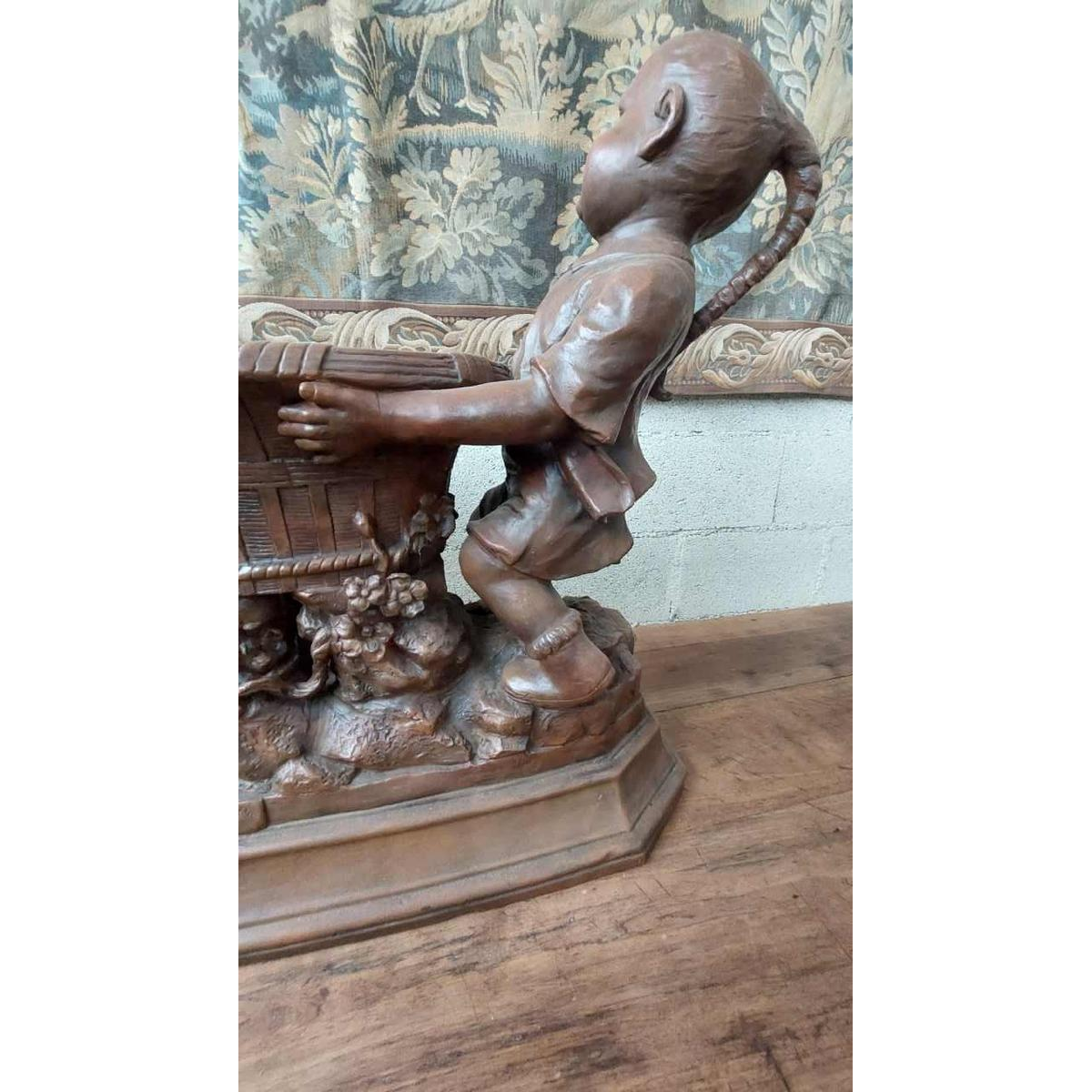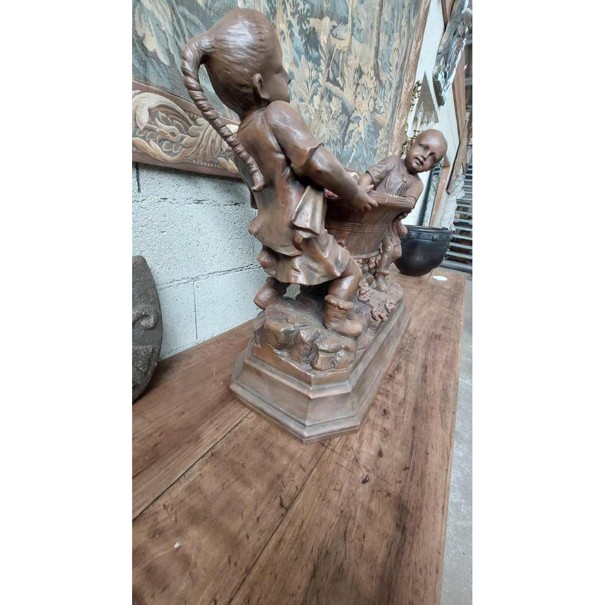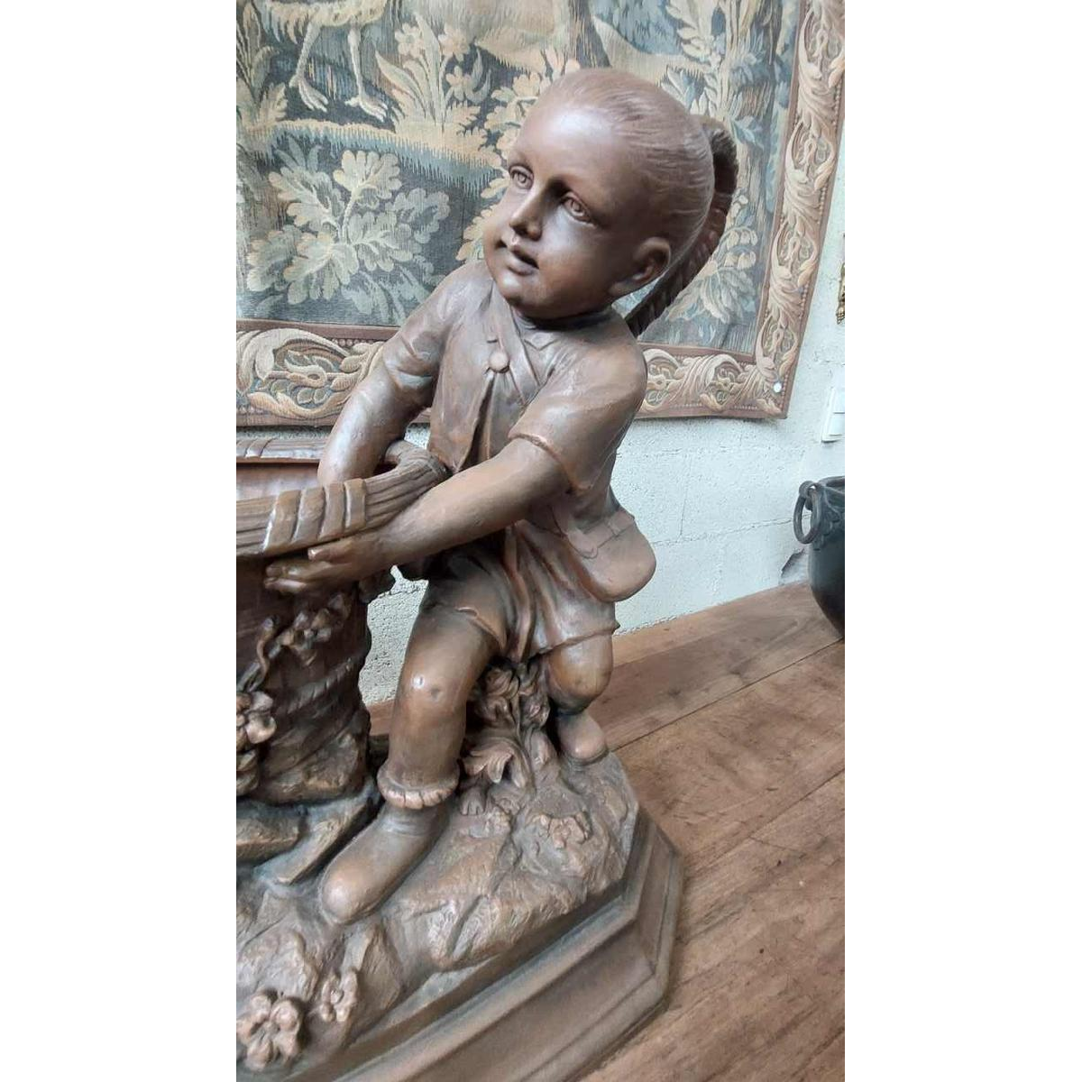 Important jardinière en terre cuite représentant 2 fillettes coiffées de nattes tenant une corbeille en vannerie avec fleurs.