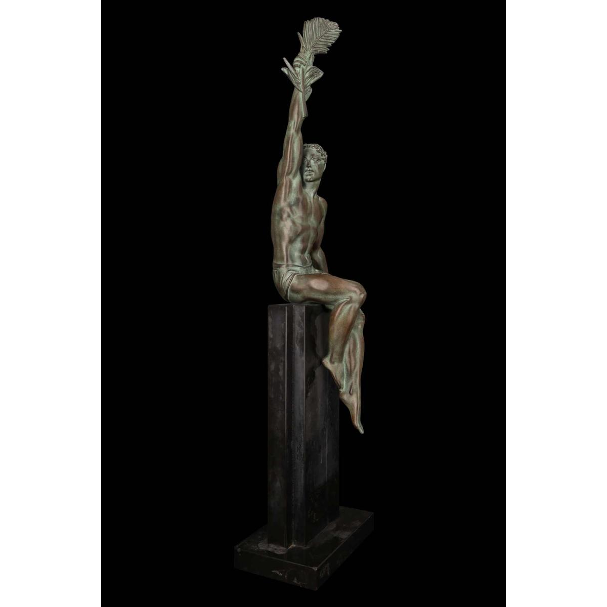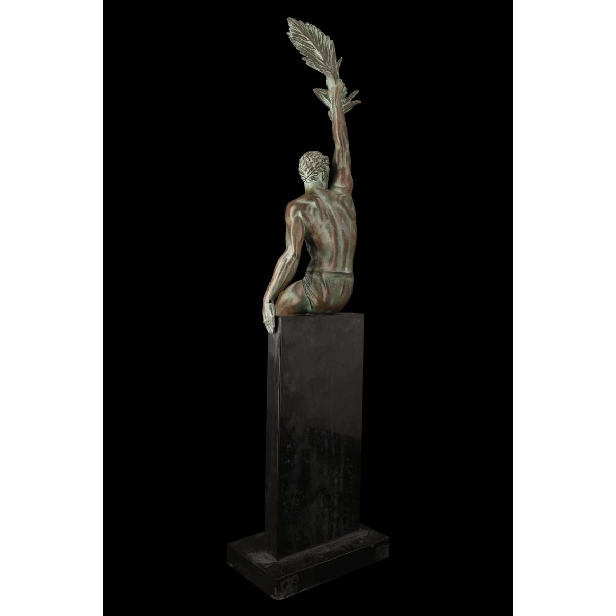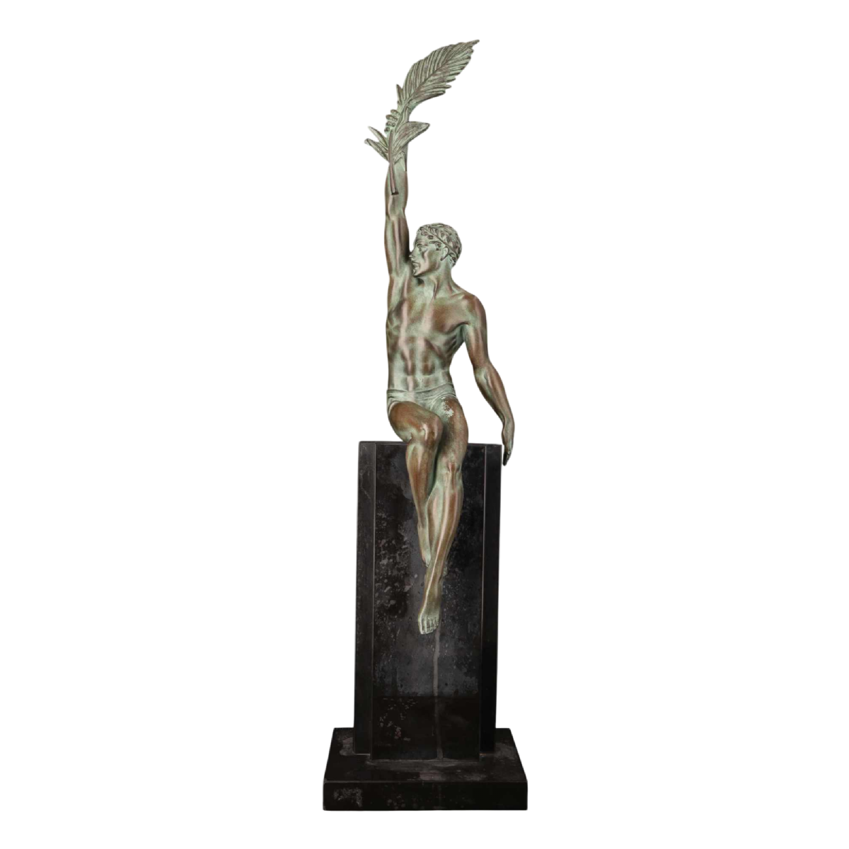 Cette sculpture en fonte patinée vert représente un athlète masculin assis sur un piédestal de marbre noir, levant haut un rameau de laurier — symbole de victoire. Le corps musclé, tendu vers le ciel, exprime l'aspiration à l'excellence. Le regard tourné vers sa main levée suggère la fierté et la quête de gloire. Le modelé est précis, fidèle à l'anatomie, empreint d'un idéalisme classique. La patine vert-de-gris renforce l'effet antique, tandis que la pose dynamique trahit une influence Art déco, à la fois stylisée et monumentale.