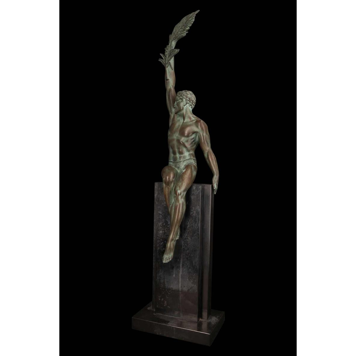 Réalisée dans la première moitié du XXe siècle, cette œuvre s'inscrit pleinement dans le mouvement Art déco, qui valorisait les formes pures, l'élégance et la puissance contenue. À l'opposé de l'abstraction, l'Art déco exalte la figure humaine idéalisée, souvent en lien avec des thèmes de sport, de vitesse, et d'héroïsme. Le rameau de laurier, typique de l'Antiquité, et le style athlétique rappellent les Jeux Olympiques modernes et leur dimension universelle. Le traitement classique du corps évoque aussi la sculpture grecque, tout en s'adaptant à la rigueur géométrique propre à l'Art déco.