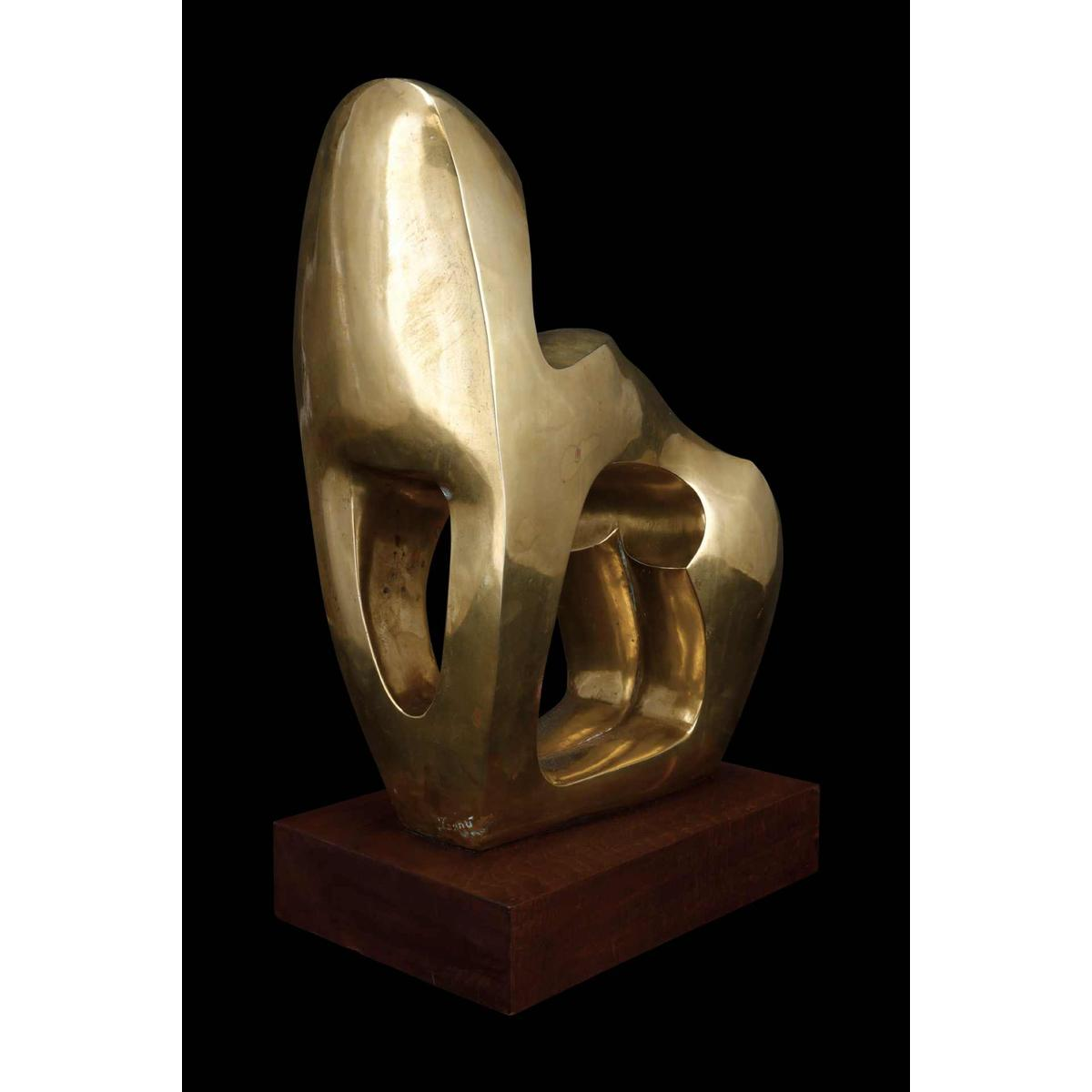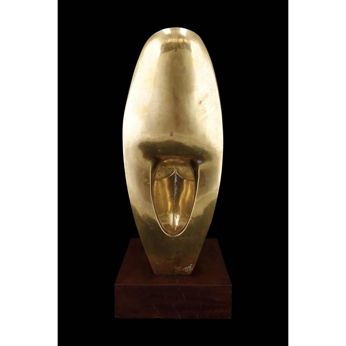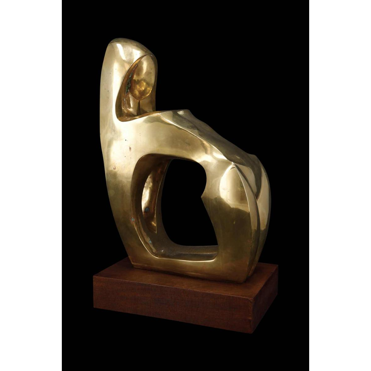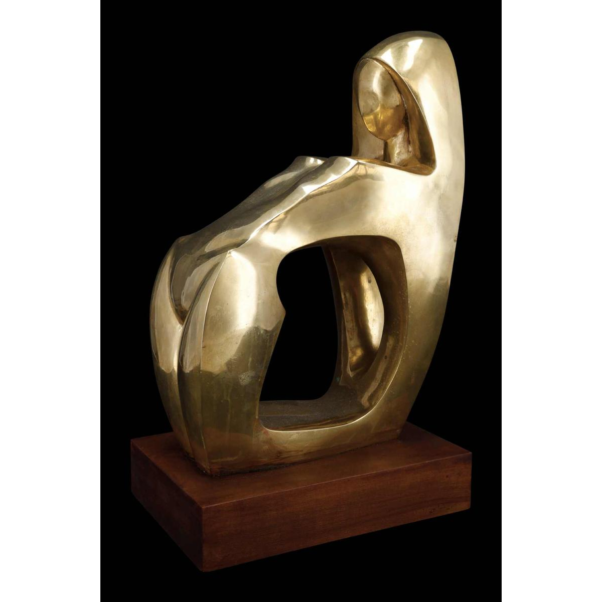 Cette sculpture en cuivre représente une figure féminine stylisée, presque abstraite, dans une posture méditative ou maternelle. Les formes pleines et sensuelles évoquent la fertilité et la force intérieure, tandis que les surfaces lisses et courbes captent la lumière, donnant à l'uvre une présence presque sacrée.