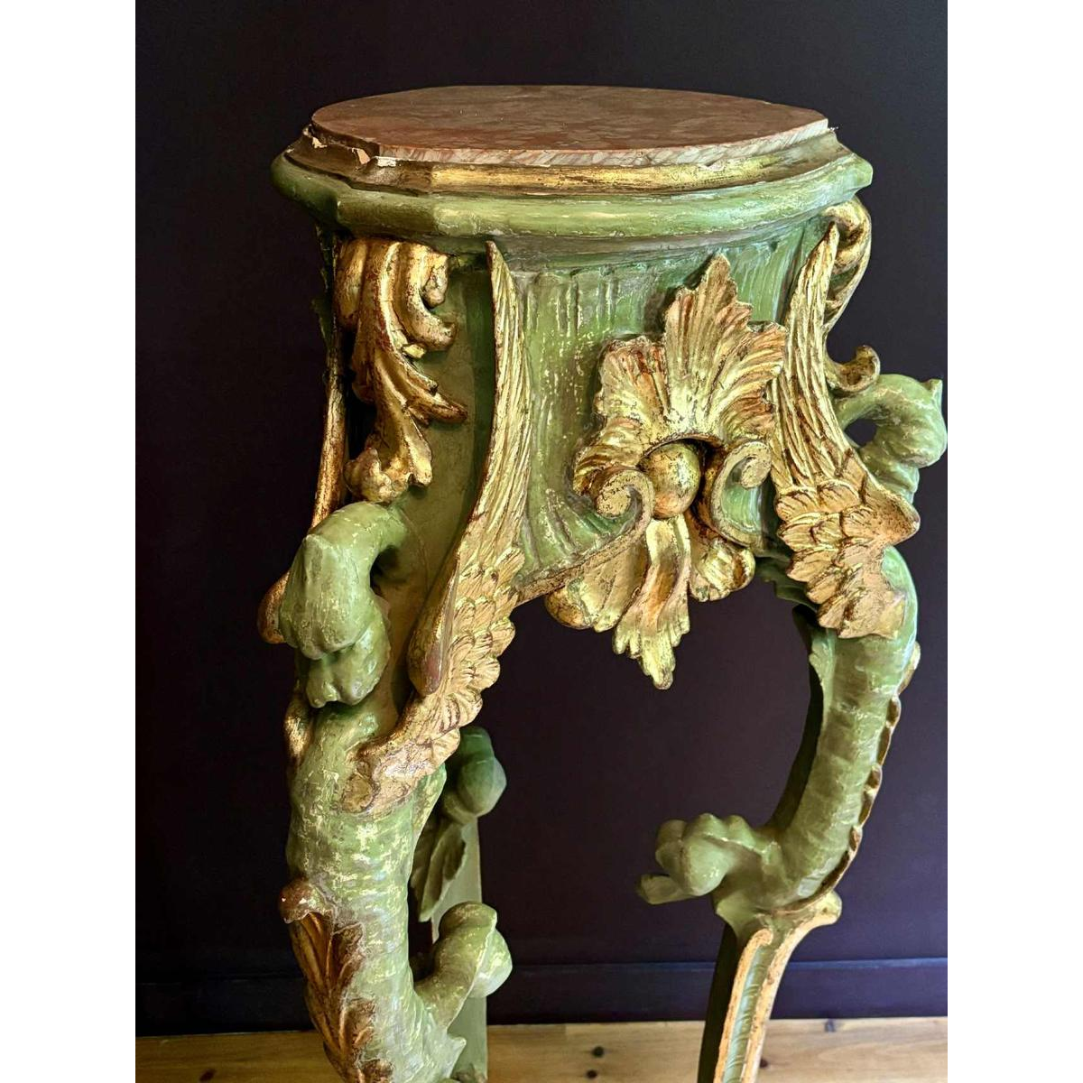 Ceinture à décors de feuilles d'acanthe, plateau en marbre rouge soutenu par trois pieds à décors de créatures fantastiques (dragons ailés) dans la partie haute, réunis par une tablette d'entrejambe.