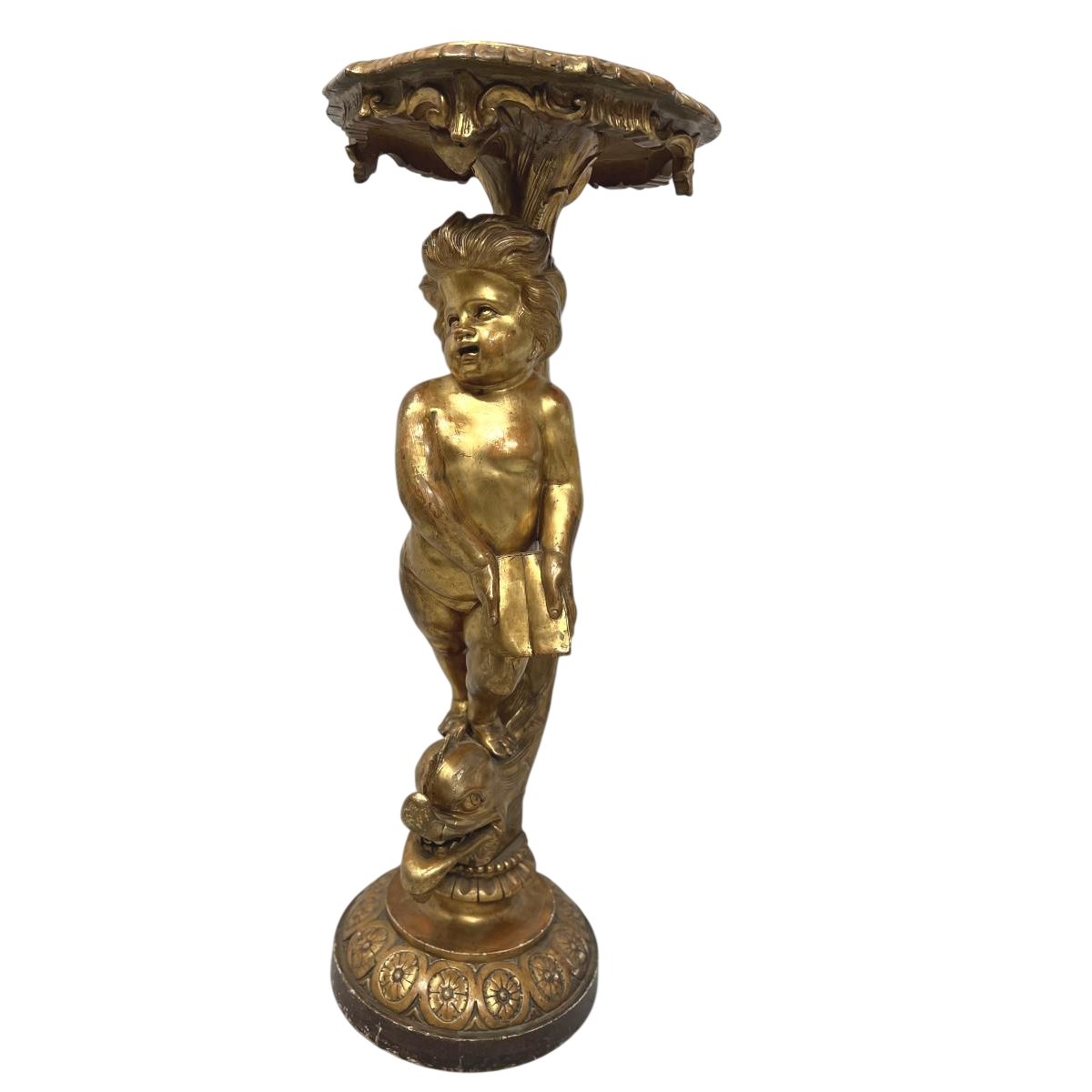 Représentation d’un putto posé sur une tête de dauphin.